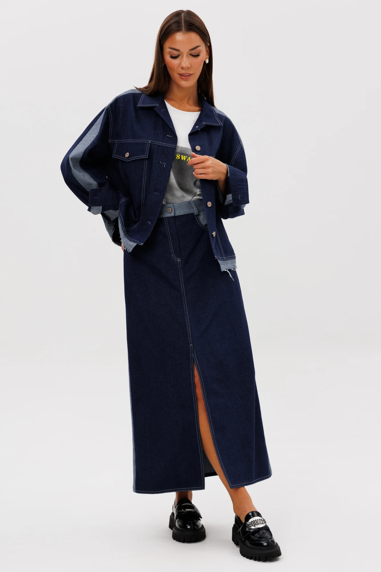 Свободный силуэт, рубашечный покрой, втачной воротник, рукав с притачной манжетой. Полочка с отрезной кокеткой, рельефами и карманом с клапаном. Спинка с отрезной кокеткой и рельефами. Рукав с локтевым швом и разрезом в нём, отделочным лампасом по центру рукава из контрастного денима, мягкой складкой и притачной манжетой. По низу куртки - притачная отделочная полоса в цвет лампаса. Застёжка центральная на петли и пуговицы.
