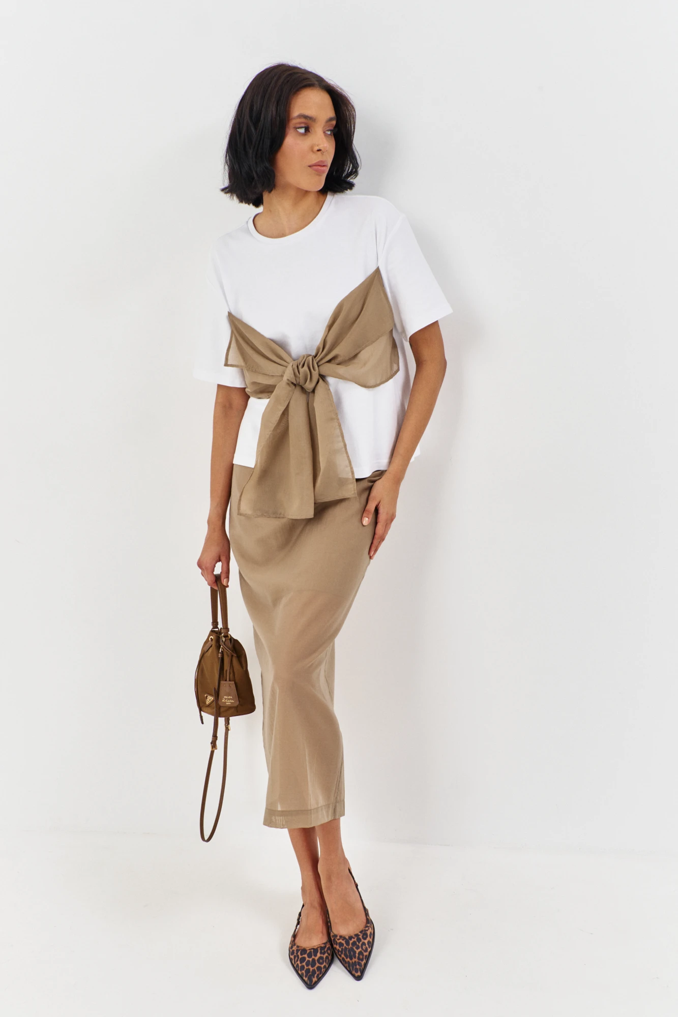 Комплект майка с юбкой. Майка свободного силуэта со спущенным рукавом. Характеристики: выполнена из трикотажного полотна в белом цвете, по переду декоративный бант в цвете капучино, горловина обработана планкой, рукав укороченный. Длина майки по переду 61 см, длина рукава 21 см. Юбка выполнена из блузочной ткани в цвете капучино, пояс обработан эластичной тесьмой (резинкой), по заднему полотнищу юбки обработан разрез. Длина юбки по боковому шву 95 см.