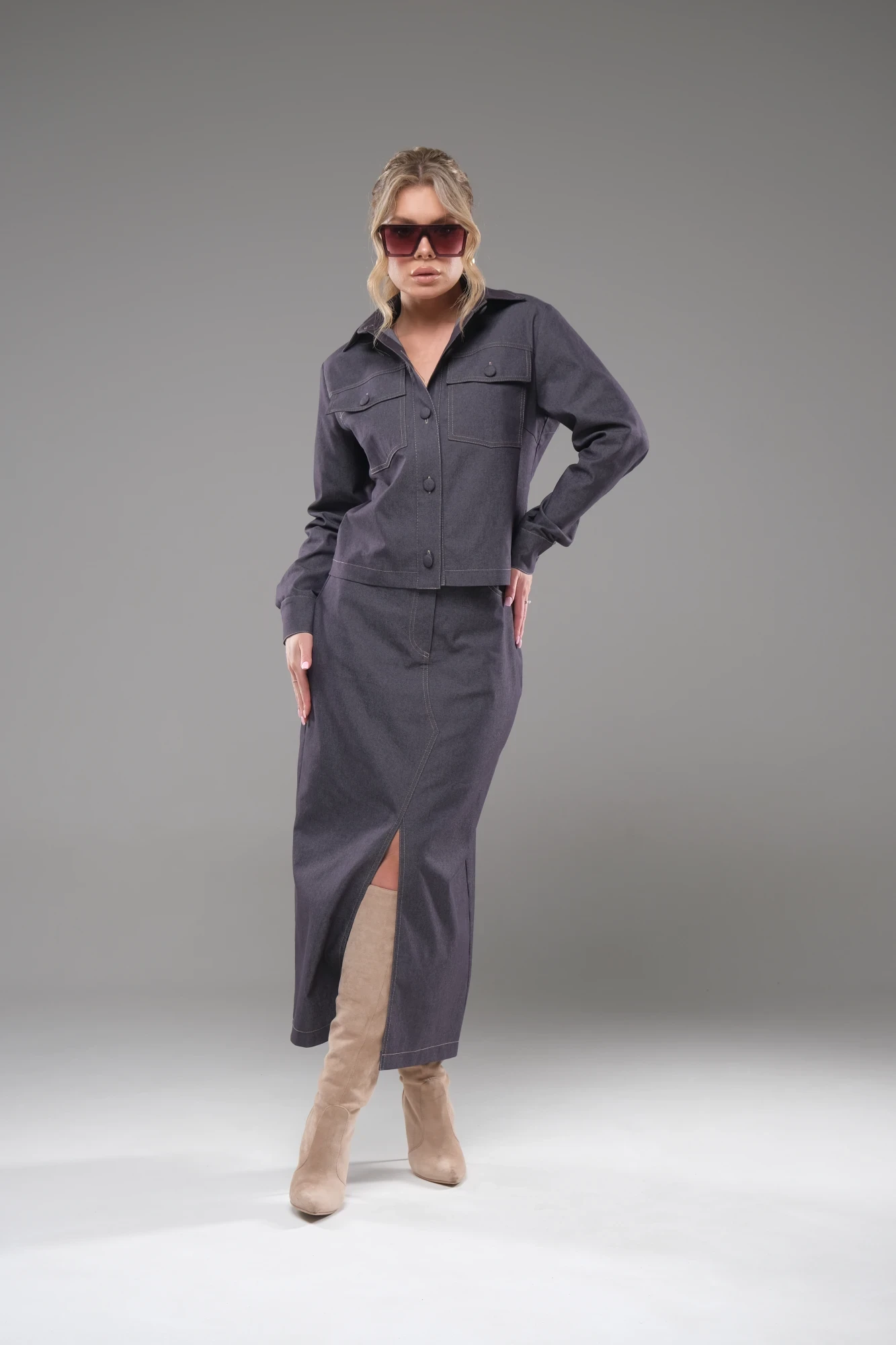 Юбка прямая с карманами, спереди застёгивающиеся на молнию. По поясу расположены шлевки.На переде обработан декоративный шов, заканчивающийся разрезом.