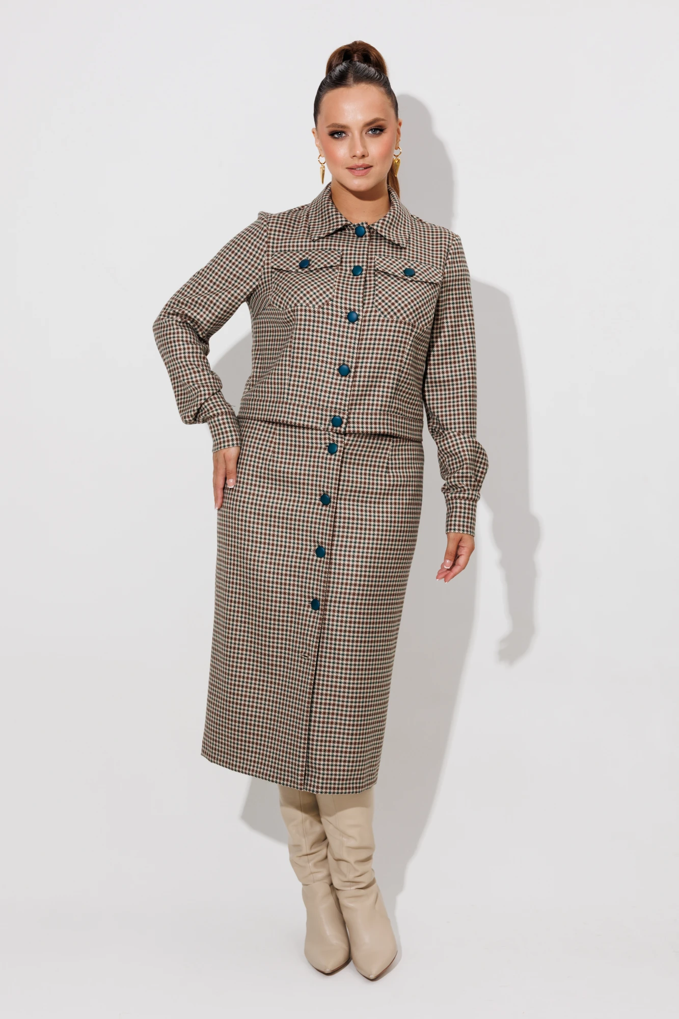 Юбка прямая, на поясе, спереди застёгивается на пуговицы.