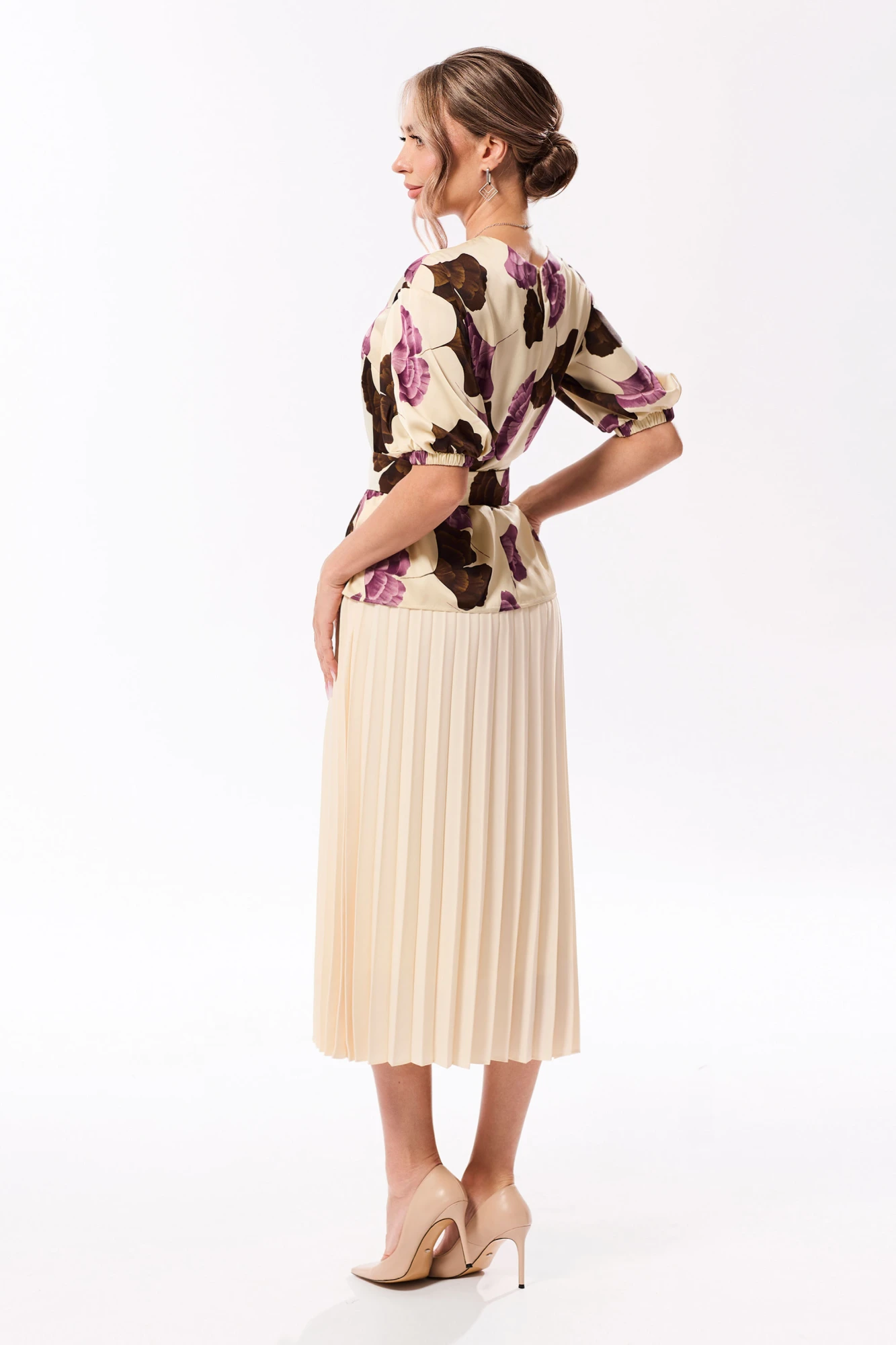 Цветовая гамма для верха, подкладки, фурнитуры, отделки: блузка выполнена из ткани в одной цветовой гамме. Юбка выполнена из ткани с рисунком.