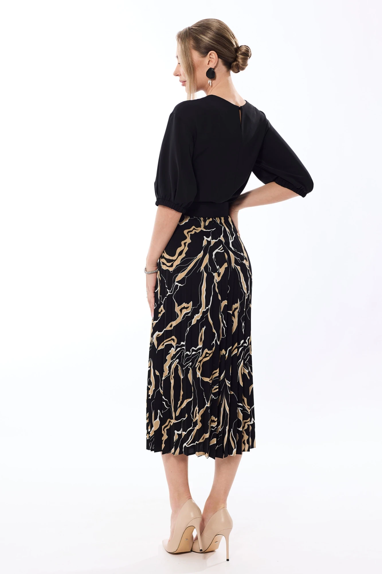 Цветовая гамма для верха, подкладки, фурнитуры, отделки: блузка выполнена из ткани в одной цветовой гамме. Юбка выполнена из ткани с рисунком.