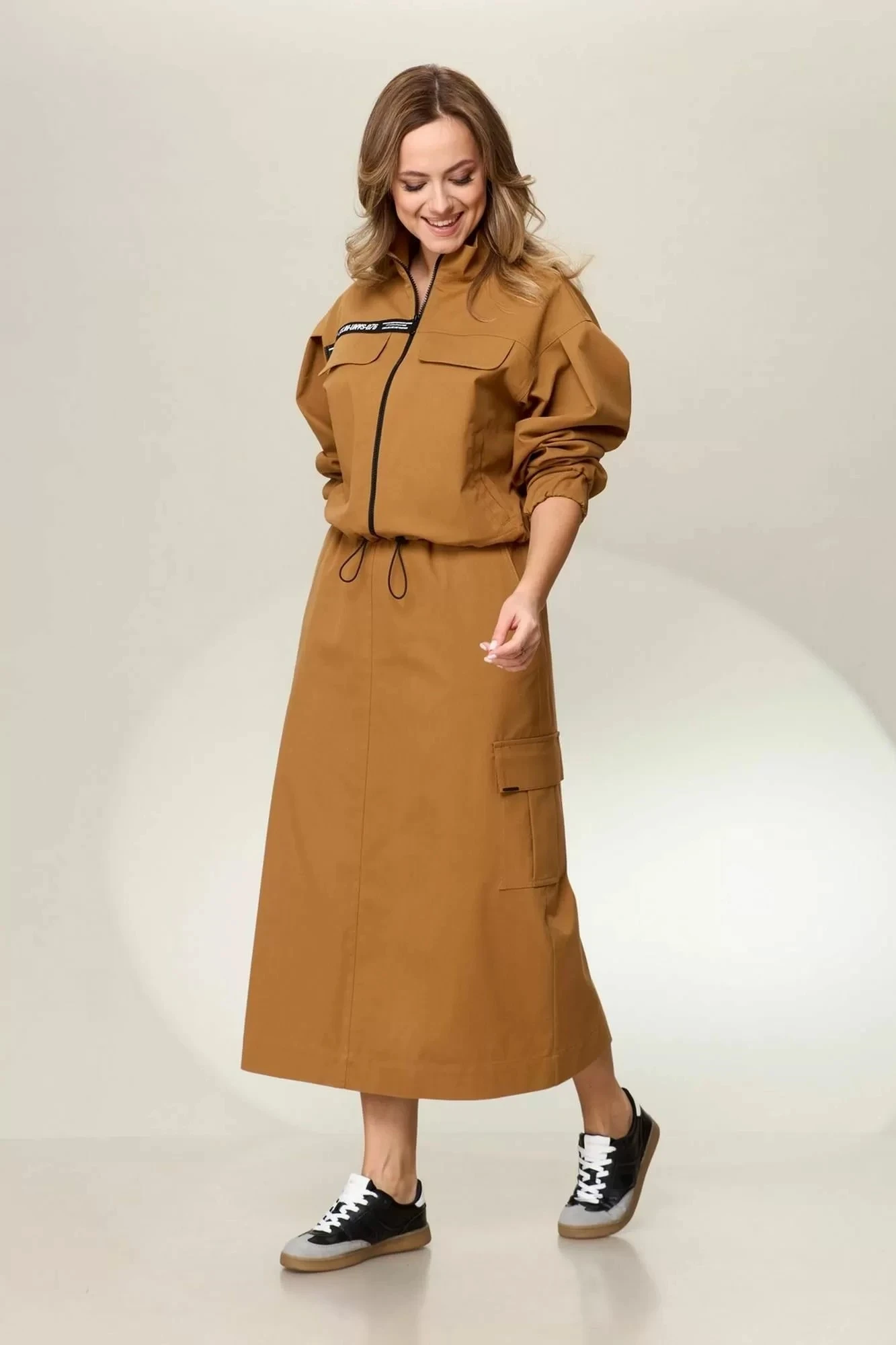 Длина рукава бомбера – 54см, ширина плеча – 19см, длина бомбера – 49см (44-48рр), 51см (50-54рр), длина юбки – 87см с учетом ширины пояса – 5см.