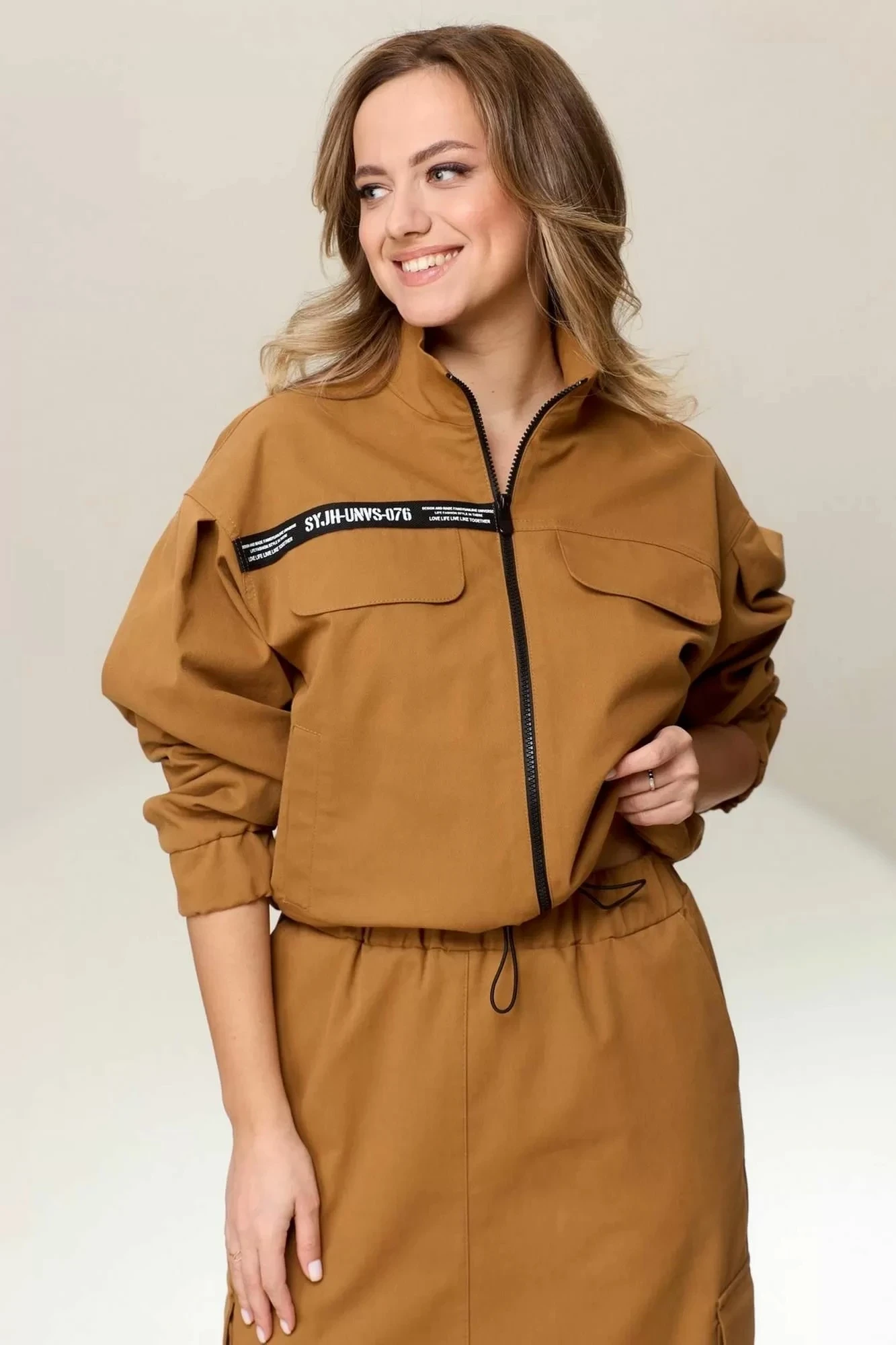Бомбер свободного силуэта, вырез горловины со стойкой, рукав спущенный со складками и манжетом по низу на резинке. По переду клапаны и карманы с листочкой. По низу изделие регулируется резинкой с фиксаторами. Застежка на тесьму молнию.