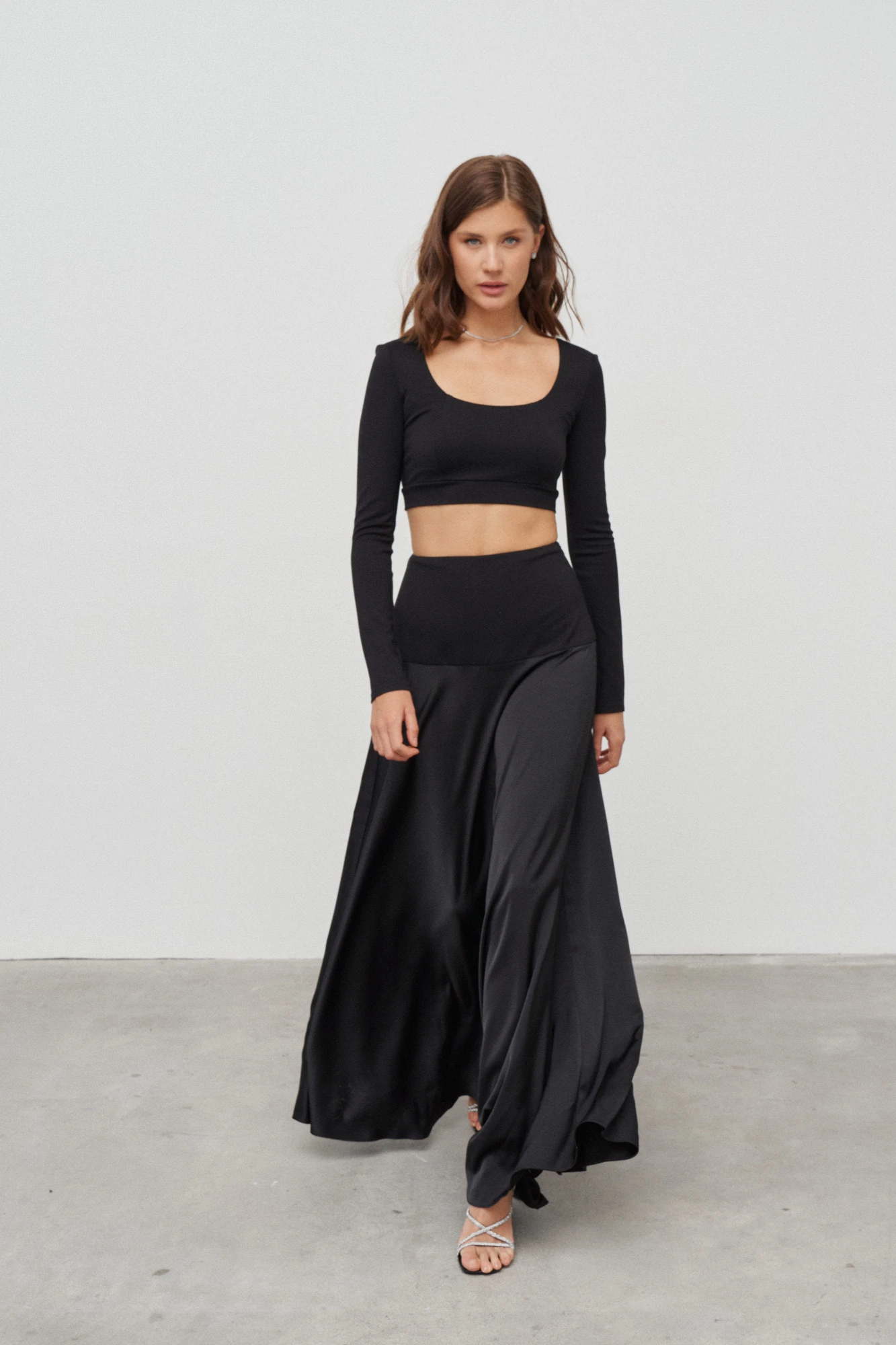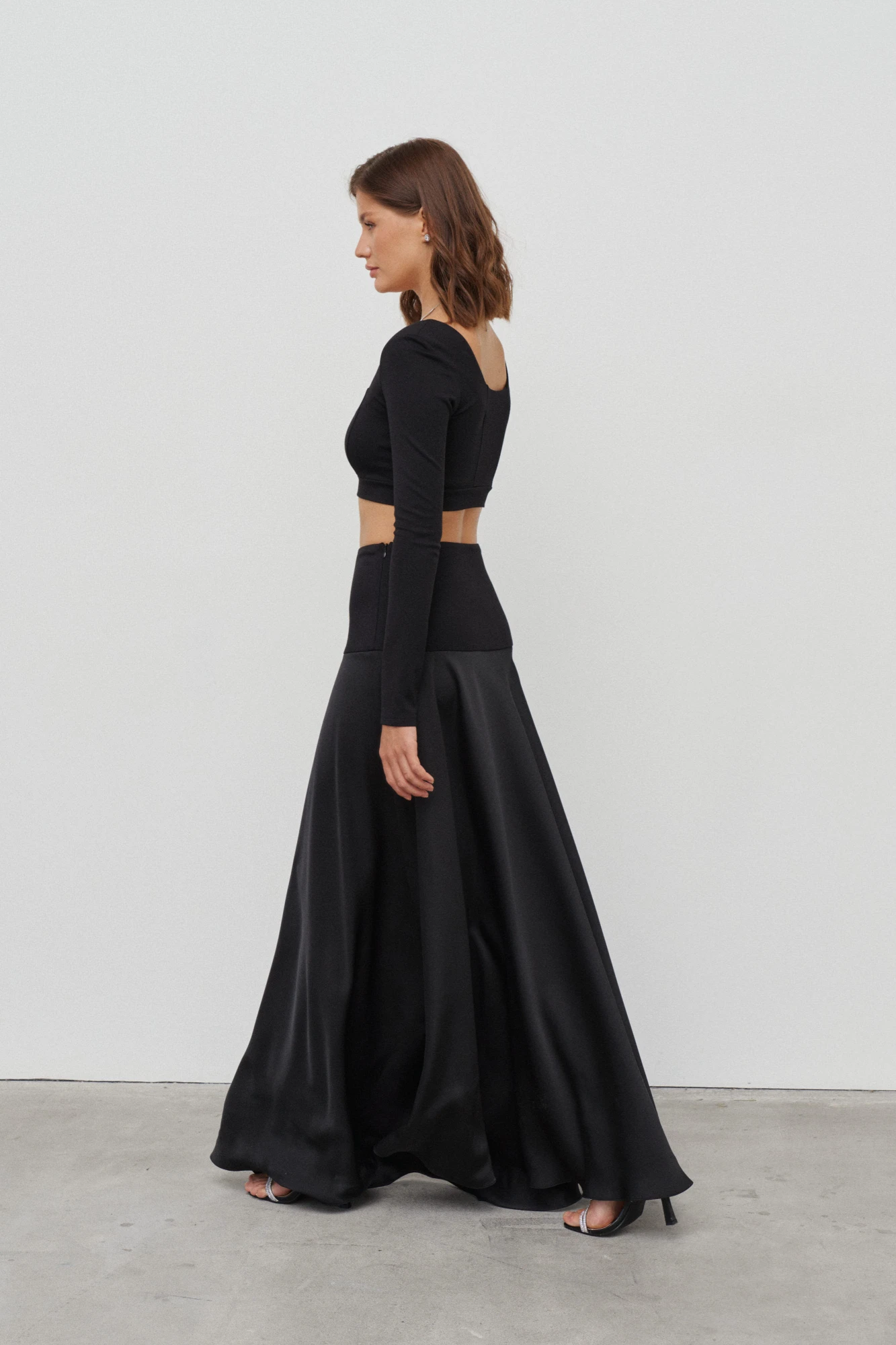 Юбка из атласной ткани с кокеткой из трикотажного полотна. Застёжка на потайную молнию сбоку