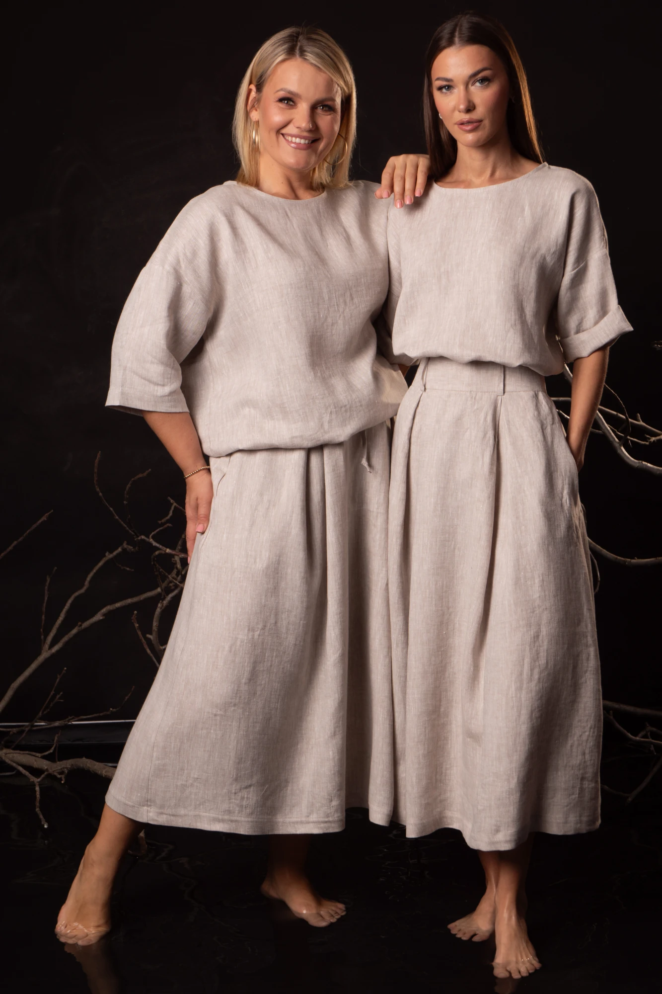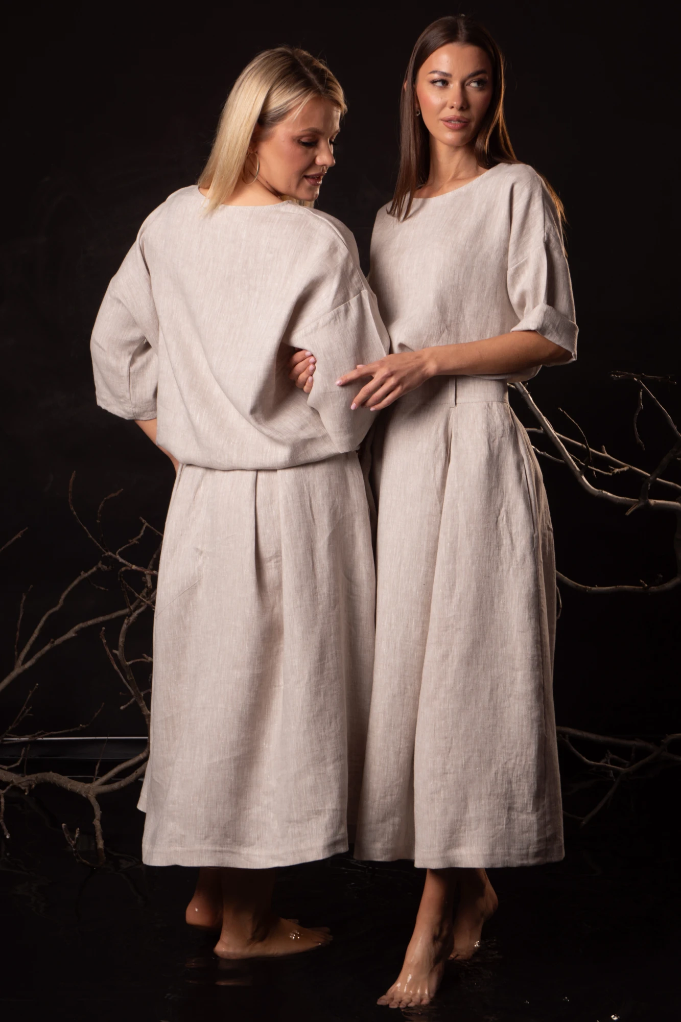 Юбка: Длинная модель с глубокими встречными складками визуально вытягивает силуэт, добавляя образу женственности и динамики. Боковые карманы в швах сохраняют практичность, а потайная молния на спинке обеспечивает аккуратную посадку без нарушения чистоты линий. Свободный крой и эластичный пояс на резинке гарантируют комфорт в течение всего дня.