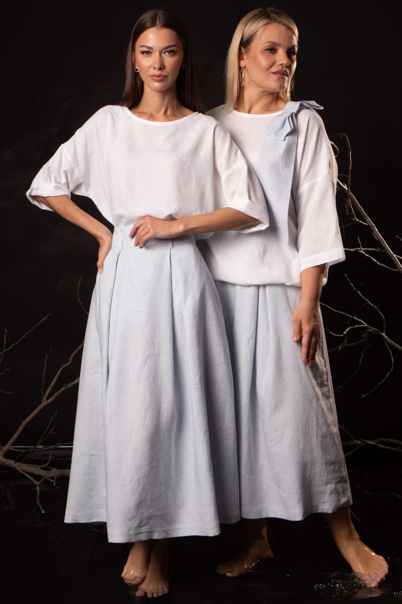 Джемпер: Свободный силуэт с круглым вырезом и съемным бантом в комплекте позволяет создавать два образа в одном — лаконичный базовый лук или утонченный акцент с романтичным штрихом. Мягкая ткань из льна и вискозы не стесняет движений, а разнообразные оттенки делают его универсальной основой для капсульного гардероба.