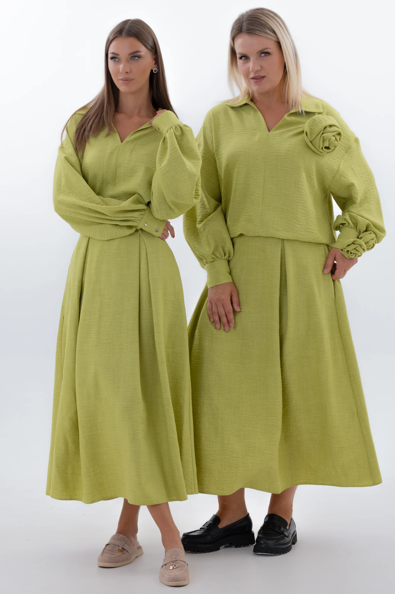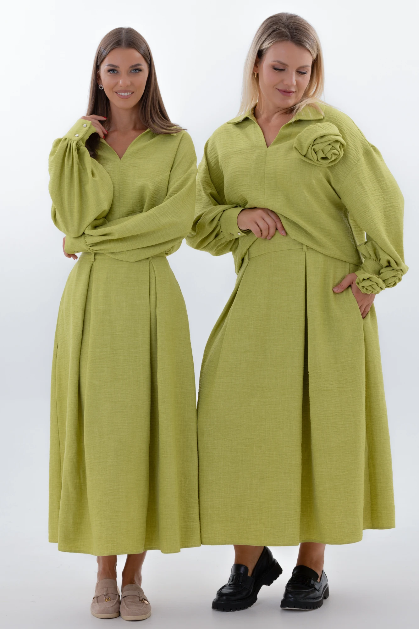 Kivvi Wear представляет идеальный дуэт, где современный шик встречается с непревзойденным комфортом. Блуза свободного кроя и удлиненная юбка-трапеция — это воплощение утонченной эстетики и свободы самовыражения. Каждая деталь этого ансамбля продумана для создания гармоничного и целостного образа.