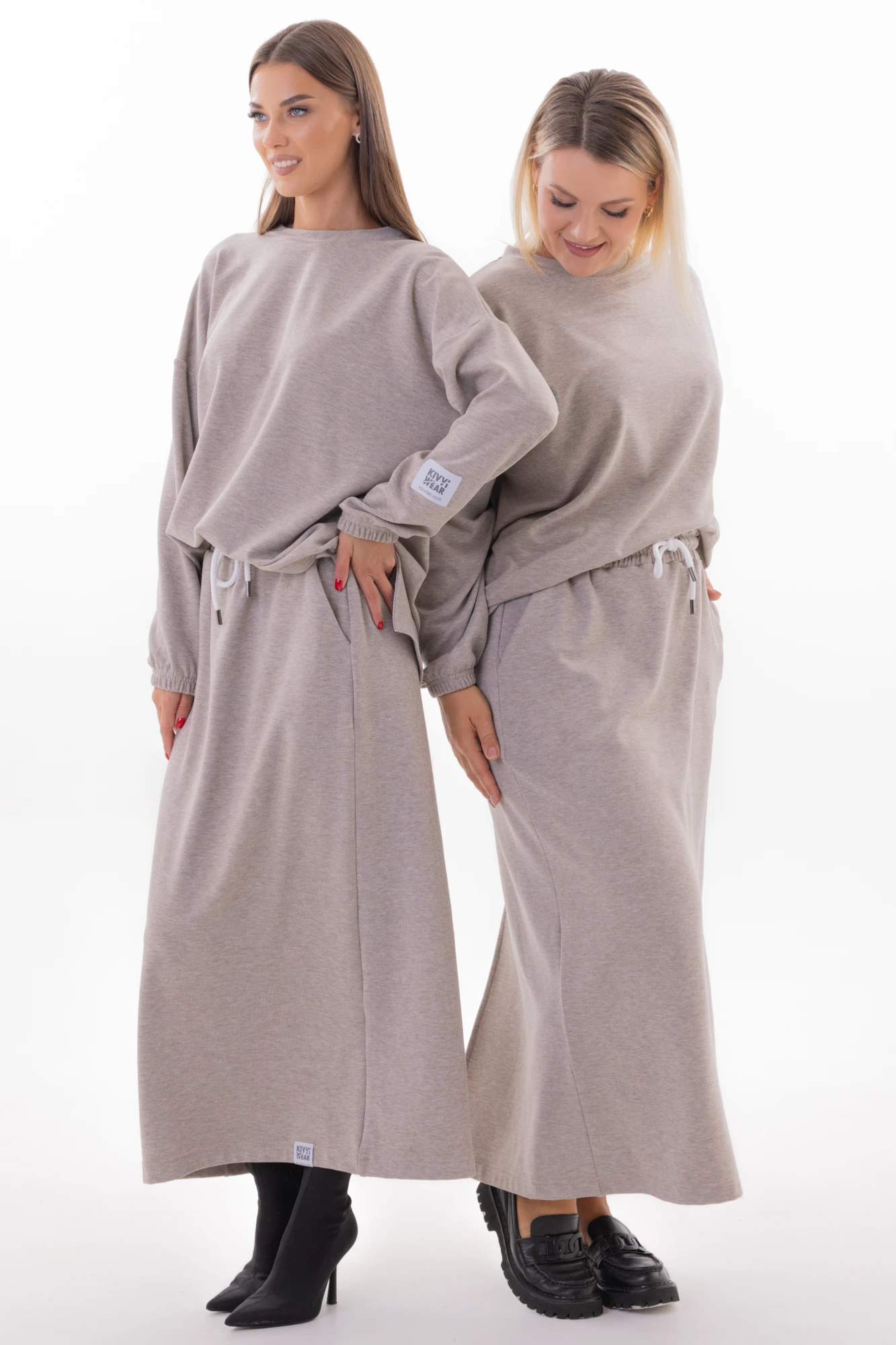 Длинная юбка продолжает тему effortless-эстетики. Пояс на резинке со шнурком мягко фиксирует талию, создавая удобную посадку, а боковые карманы и разрез по спинке делают её практичной и подвижной. Струящийся силуэт подчеркивает женственность, не ограничивая движений.