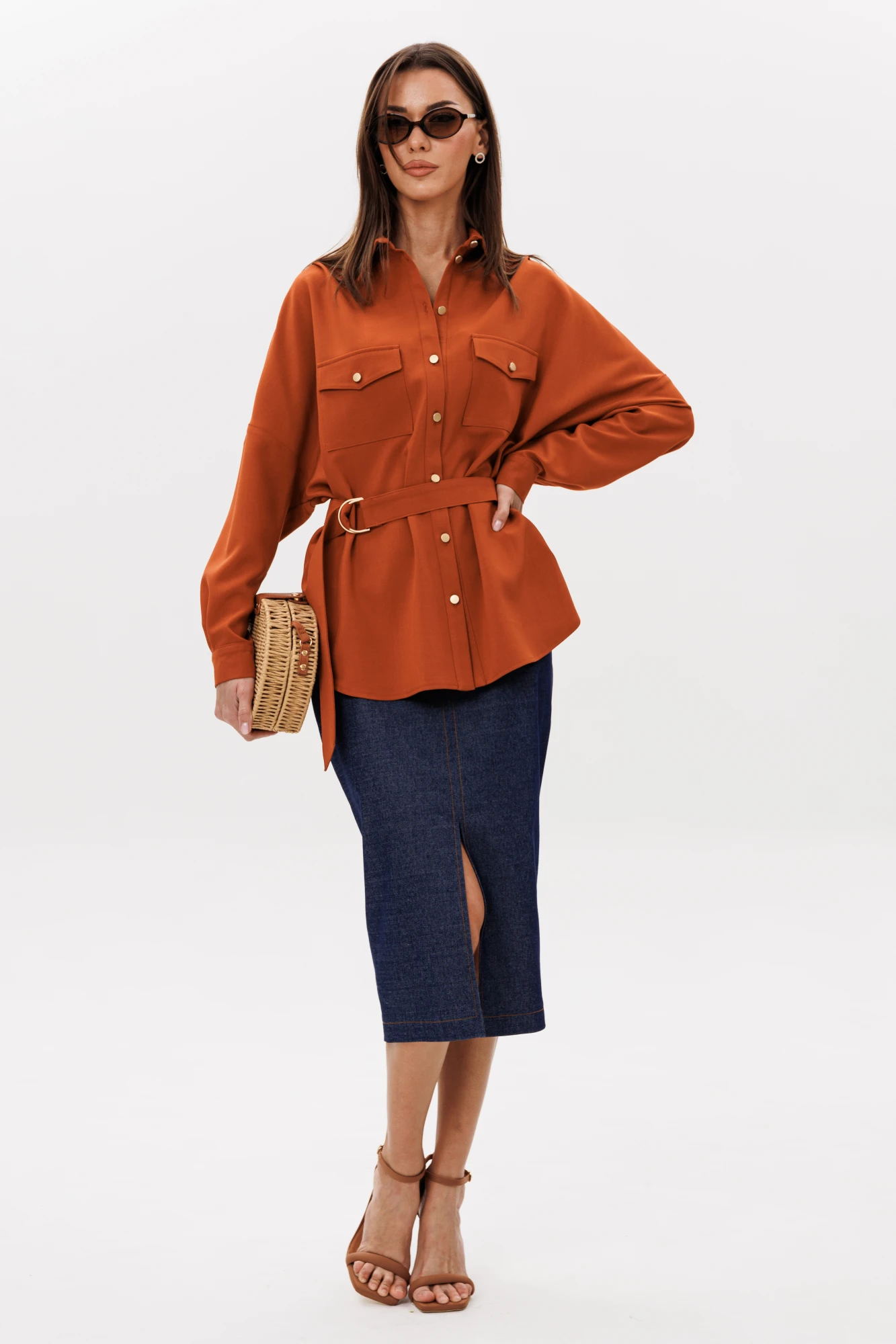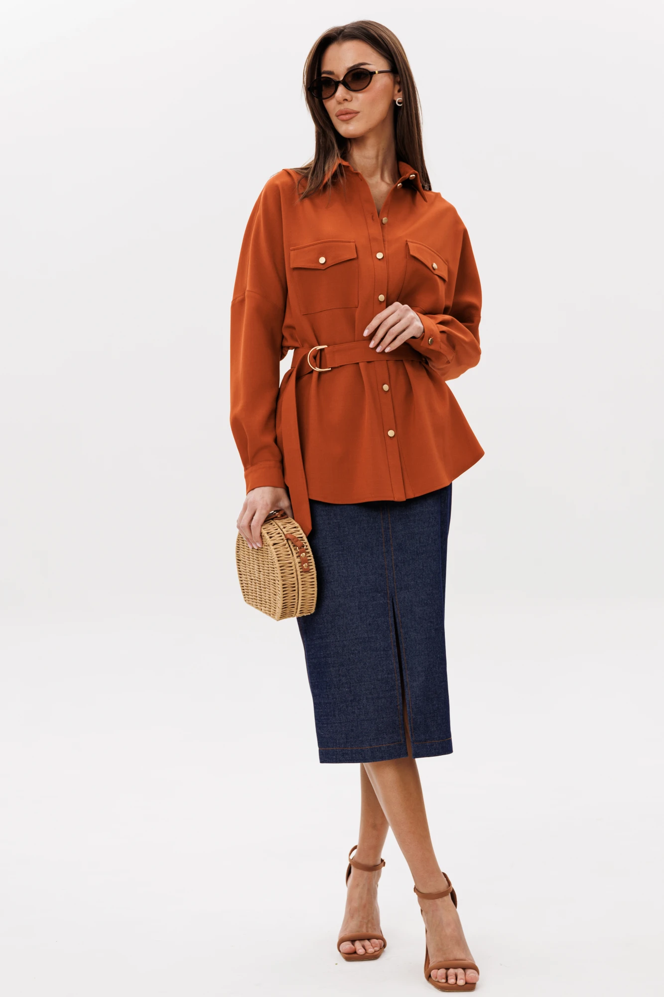 Блузон-рубашка стиля оверсайз прямого силуэта с рубашечным воротником на стойке и зауженным рукавом на манжете, со спущенной линией плеча. Спереди на