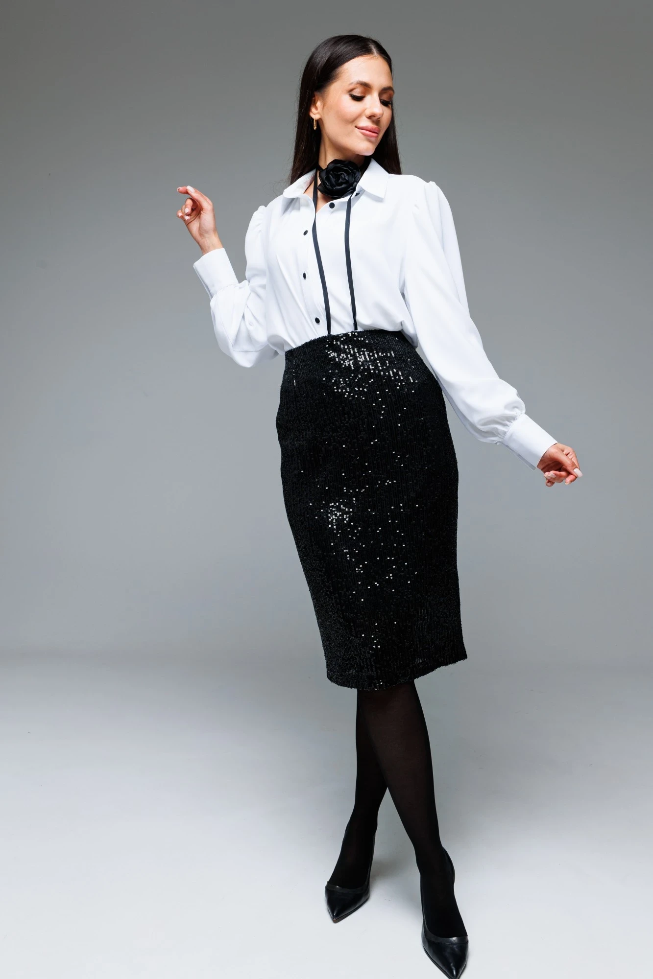 50Юбка на подкладке прямого силуэта, чуть зауженная к низу. В среднем шве размещена потайная молния и открытый разрез. На линии талии размещены классические вытачки. Пояс внутренний, обтачной. Длина юбки по боковому шву 70 см. Высота разреза 21 см.