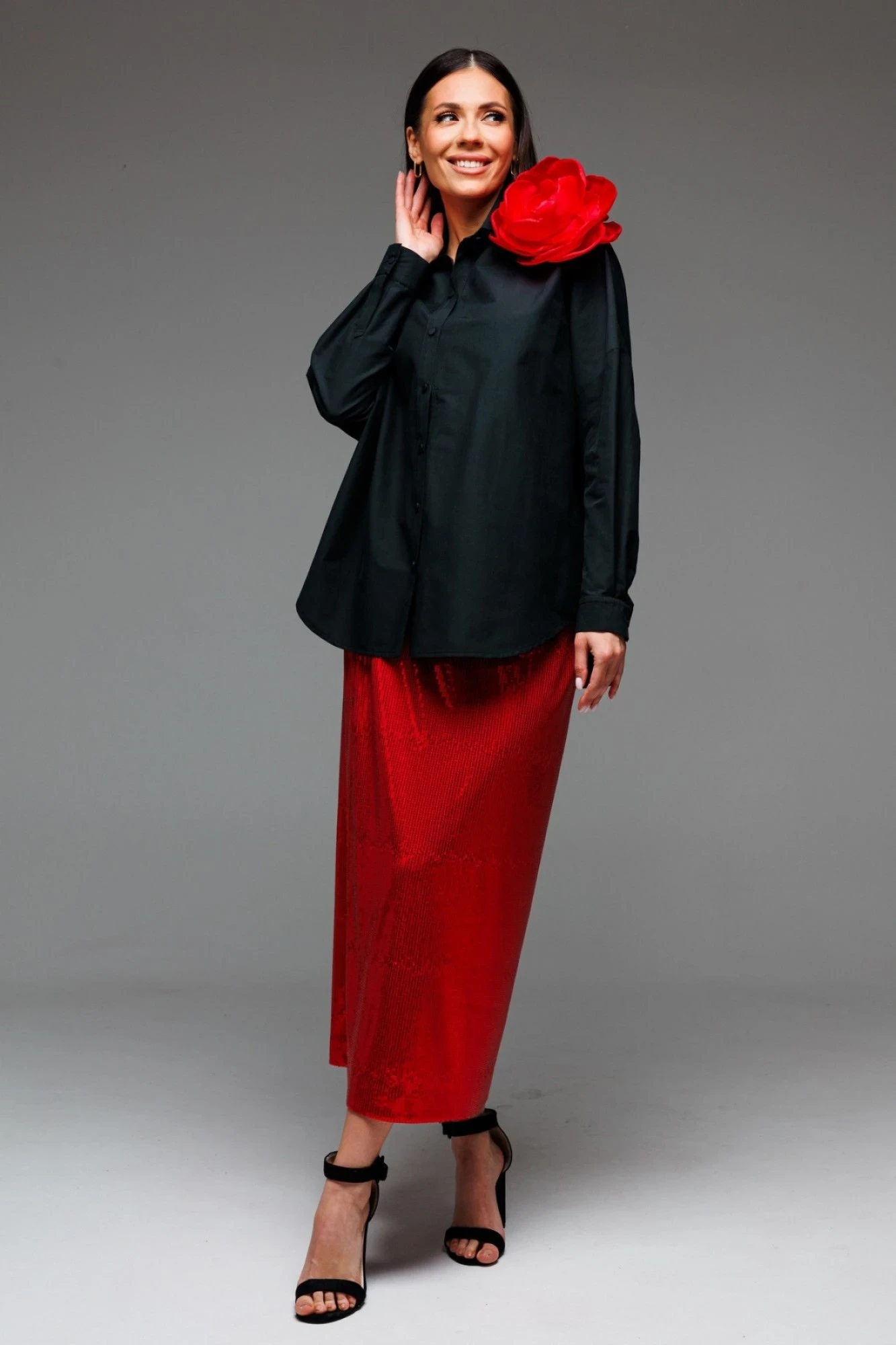 Юбка длинная, прямого силуэта из пайеток на подкладке. Длина изделия по среднему шву 94 см. Линия талии оформлена цельнокроенным поясом с эластичной тесьмой, высотой 3,5 см. Дополняет комплект брошь-декор в виде цветка.