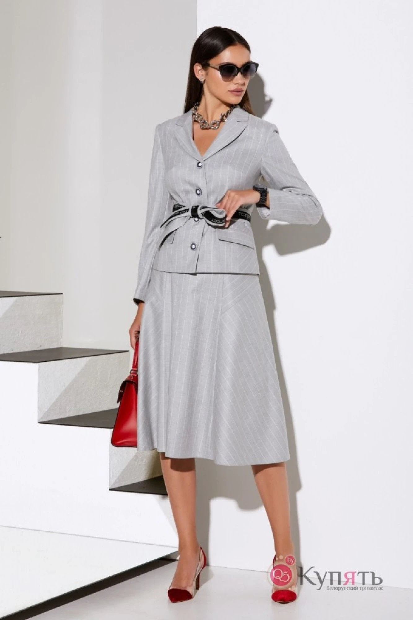 46,48,50Жакет с воротником пиджачного типа, центральной застёжкой на петли и пуговицы и съёмным поясом из основной ткани с настроченной тесьмой. Перед с карманами с клапанами в нижней части. Спинка со средним швом и талиевыми вытачками. Рукава втачные. Жакет на подкладке. Юбка на притачном поясе. Переднее полотнище с листочками в верхней части, отрезной центральной деталью и декоративной кокеткой. Заднее полотнище с кокеткой и потайной молнией в среднем шве. Юбка на подкладке.