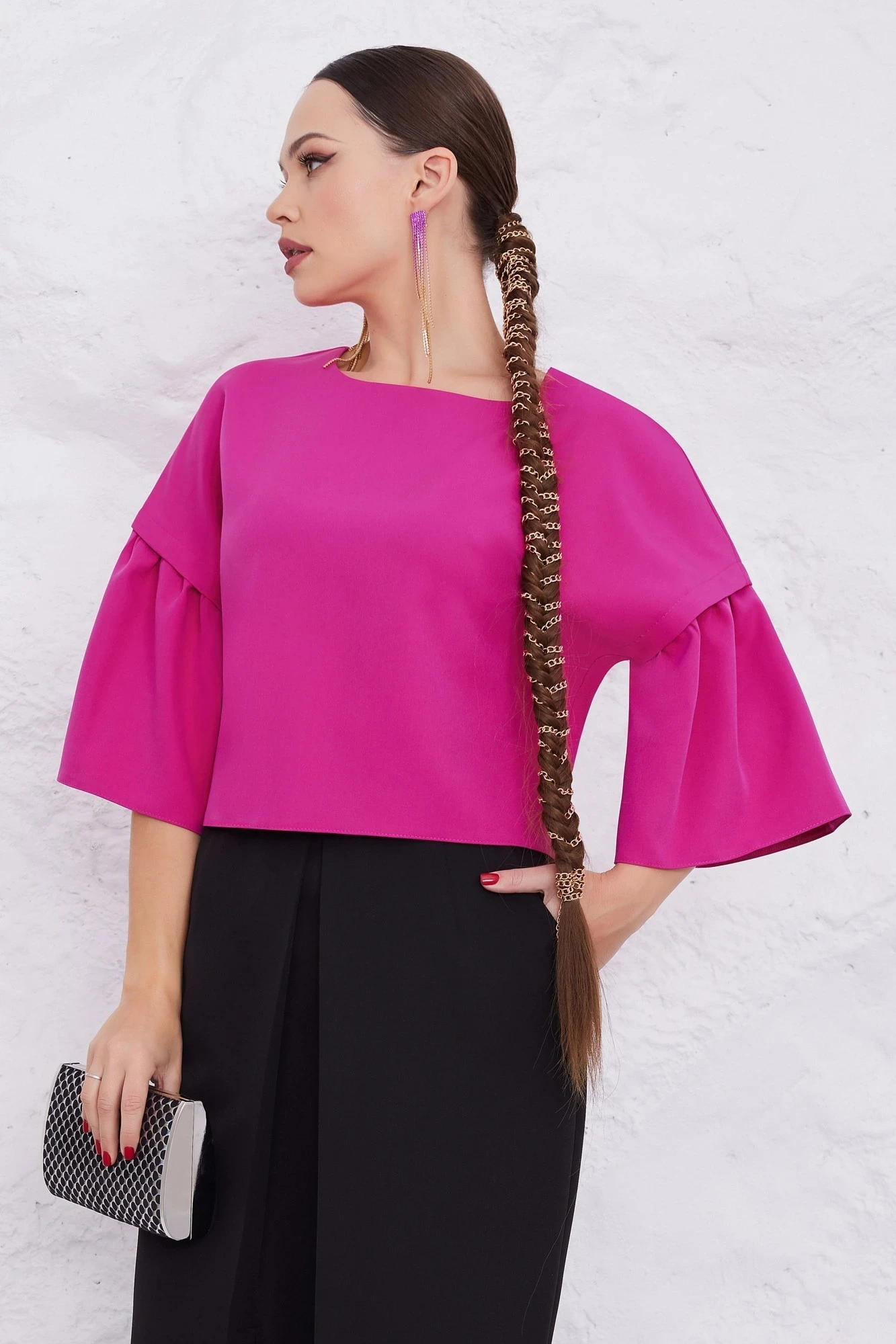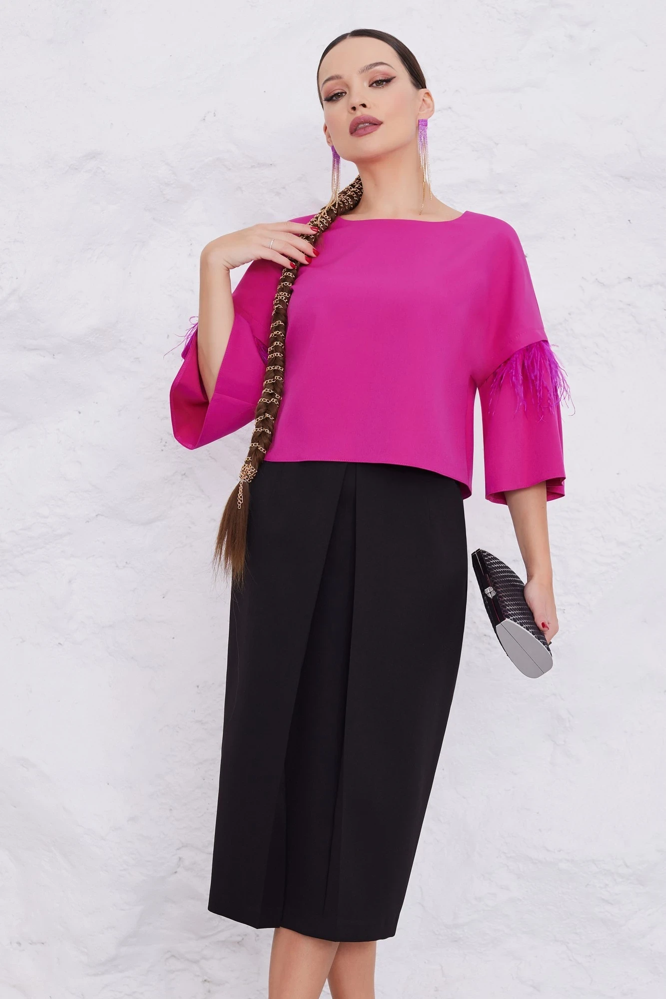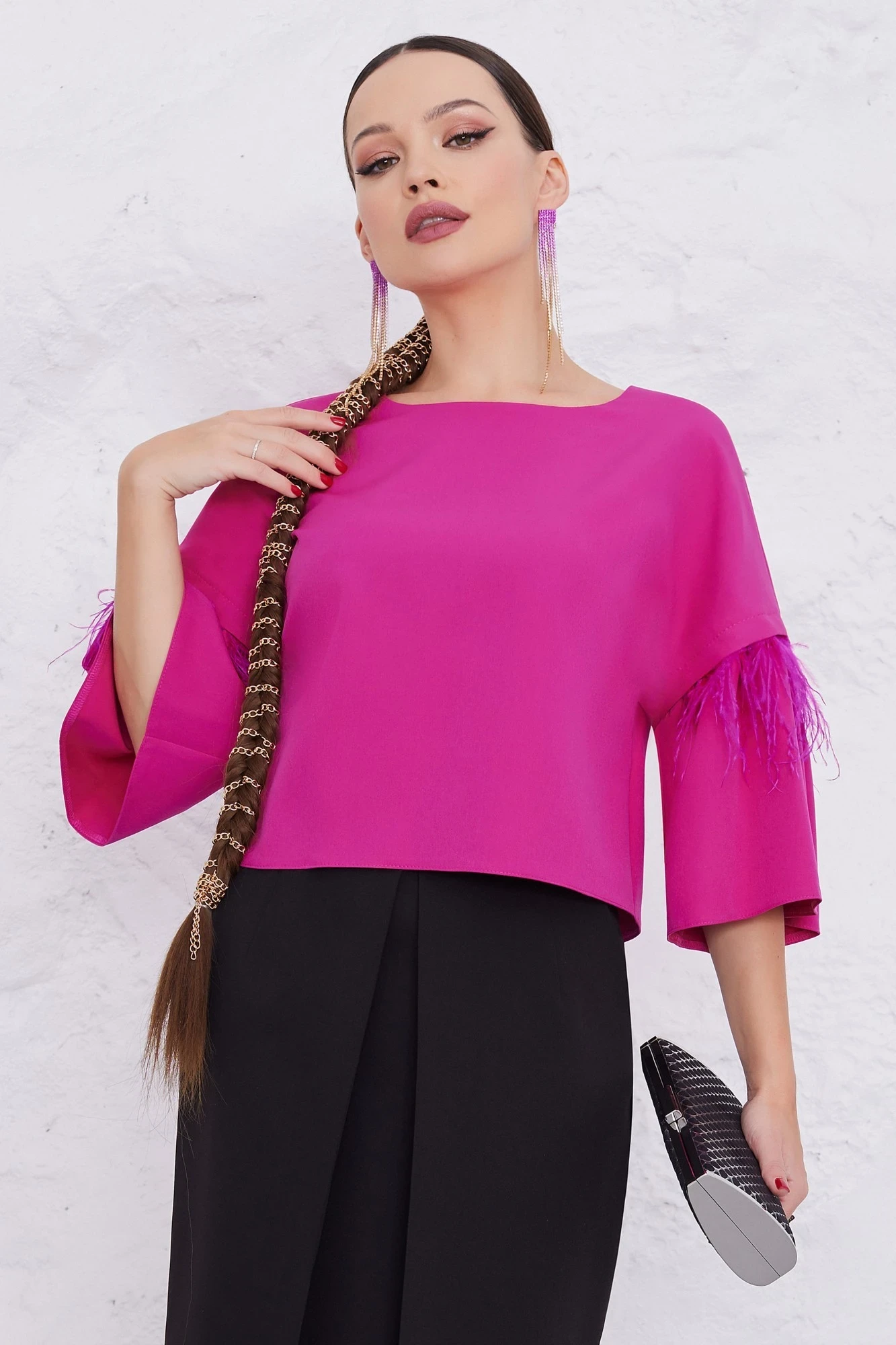 46,48Блуза со спущенной линией плеча. Рукава втачные с тесьмой. Тесьма с перьями съёмная. Спинка с потайной молнией в среднем шве.
