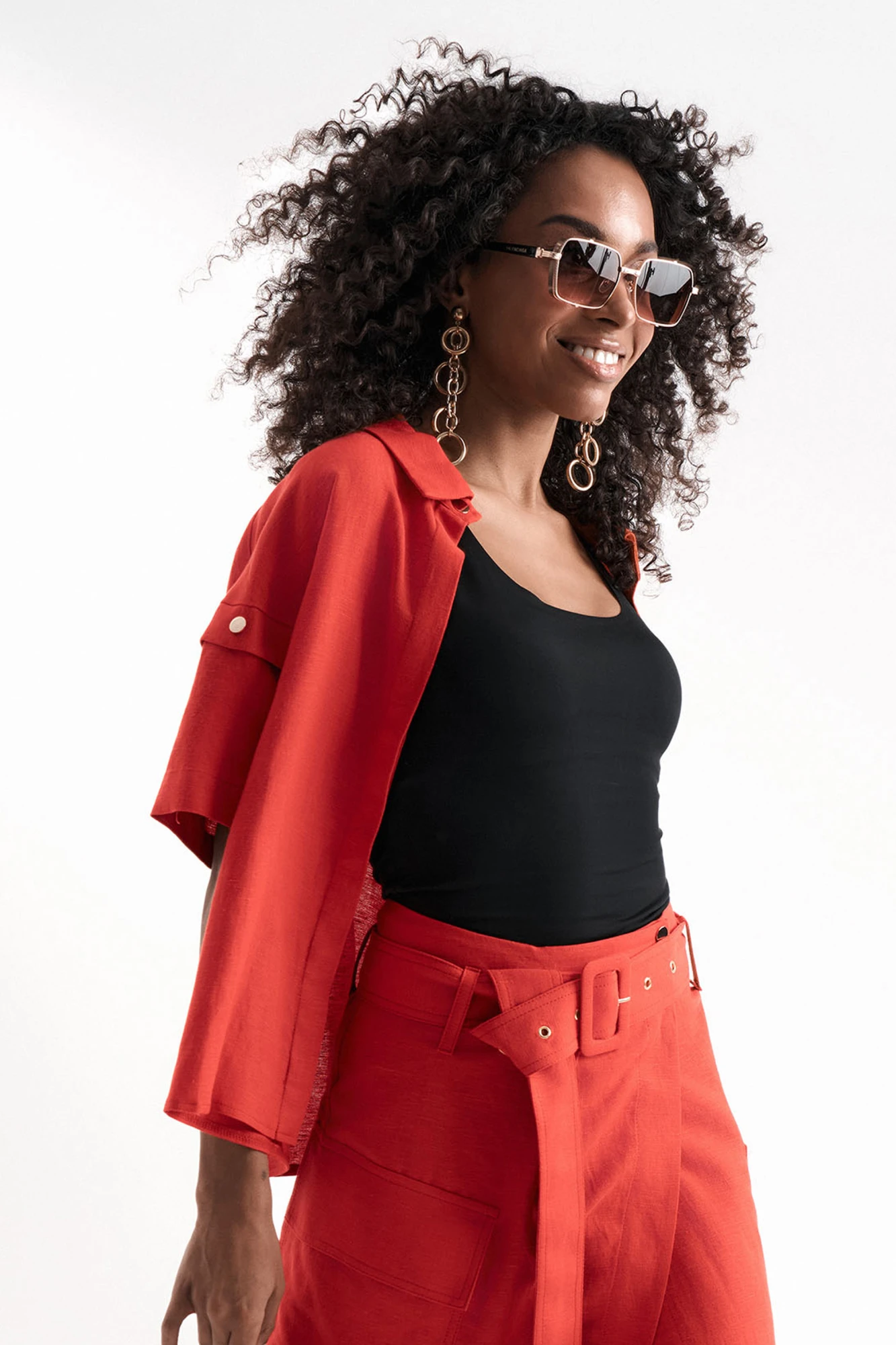 46,48Блуза со стояче отложным воротником и центральной застёжкой на потайные петли, пуговицы и одну кнопку. Изделие со спущенной линией плеча. Рукава втачные, частично с застёжкой на кнопки.