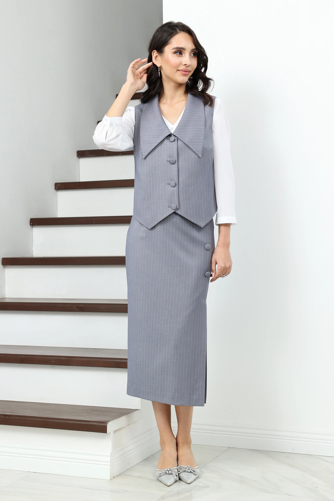 Юбка на поясе с резинкой. Переднее полотнище с разрезом и декоративными пуговицами. Заднее полотнище с потайной молнией в среднем шве. Юбка на подкладке.