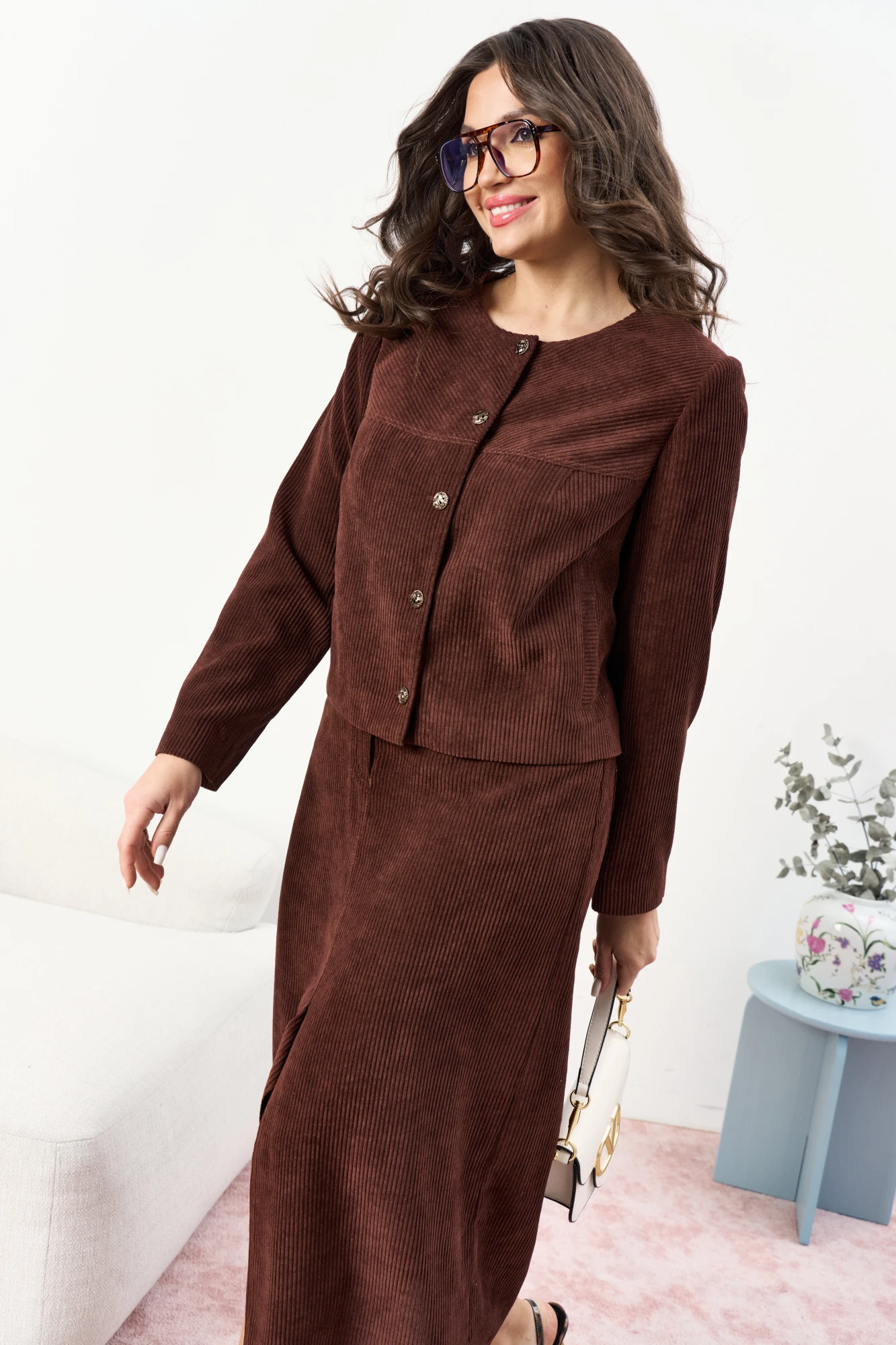 Жакет с округлым вырезом горловины и центральной застёжкой на пуговицы. Перед с отрезной кокеткой в верхней части и карманами в рамку в нижней. Рукава втачные. Жакет на подкладке.