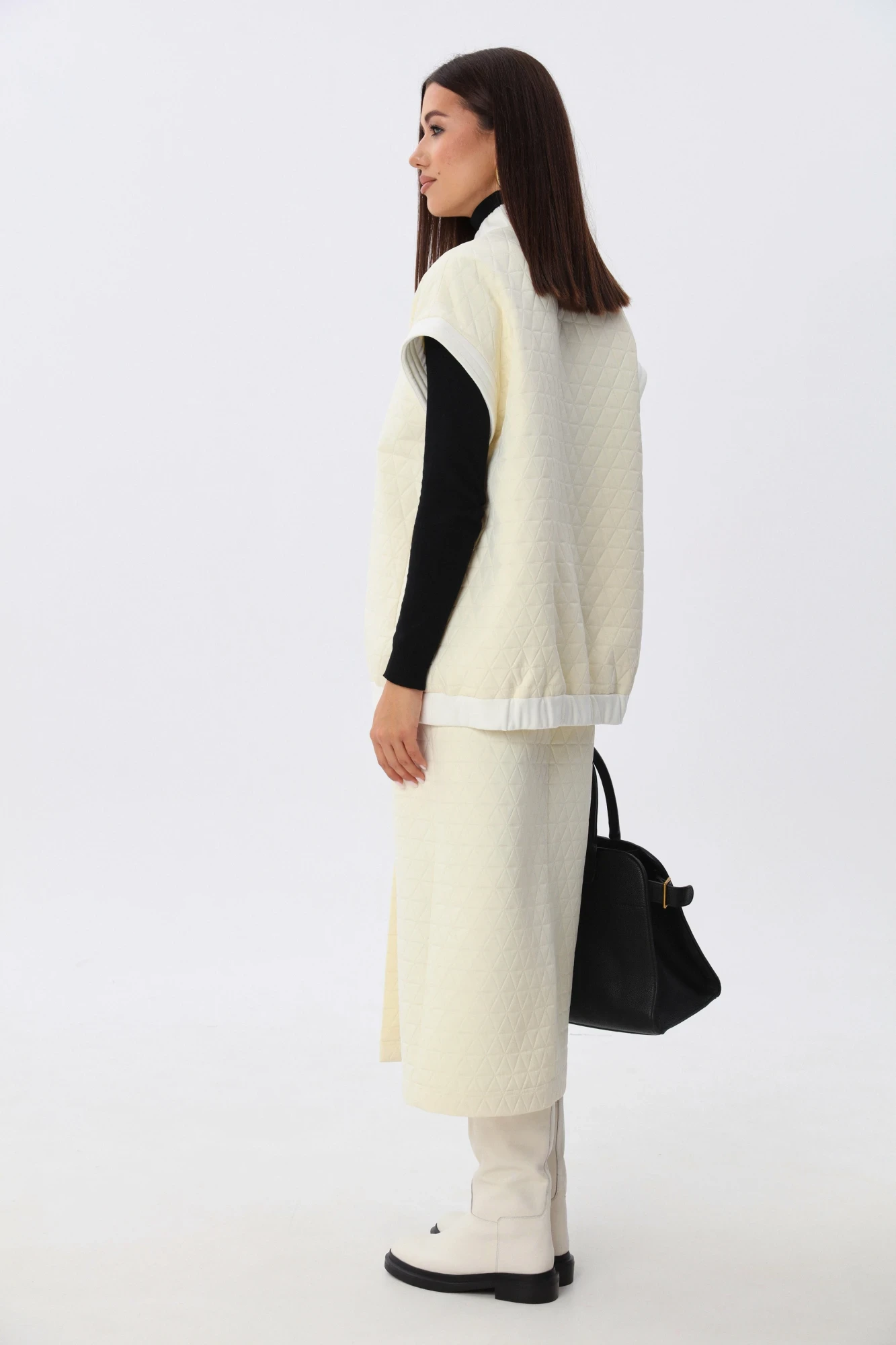 Рост фотомодели 175 см. Размер у фотомодели – 44. Длина юбки в 44 размере 83 см, длина жилета по спинке 68 см.