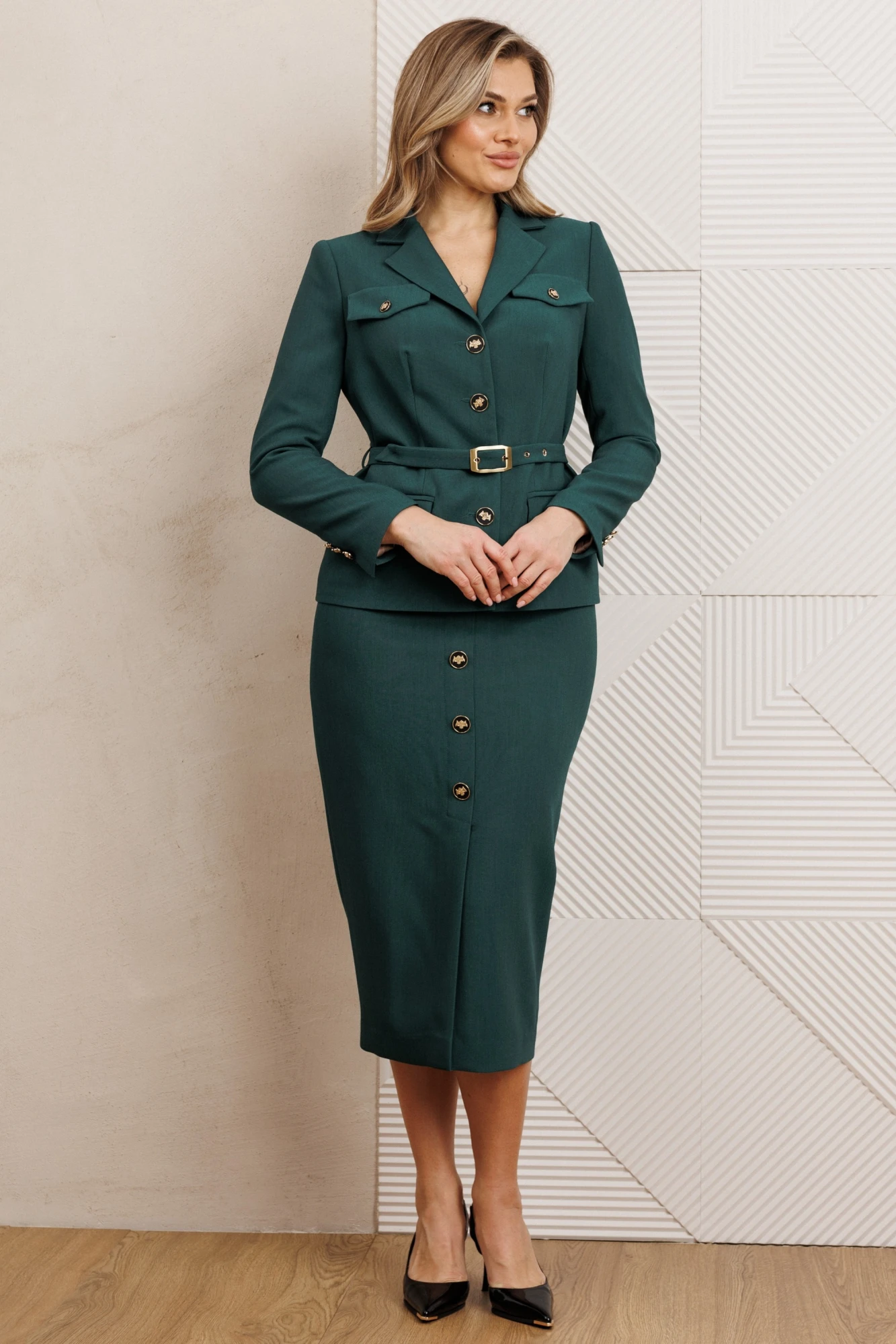 Жакет полуприлегающего силуэта с центральной застежкой на петли-пуговицы. Спинка со средним швом. По переду – талиевые вытачки, карманы с клапаном и декоративные клапаны в области груди. Воротник пиджачного типа. Рукава втачные, двухшовные. Локтевой шов заканчивается отлетной шлицей с декором из ряда пуговиц. Жакет на подкладке. Жакет дополнен съёмным поясом с пряжкой.
