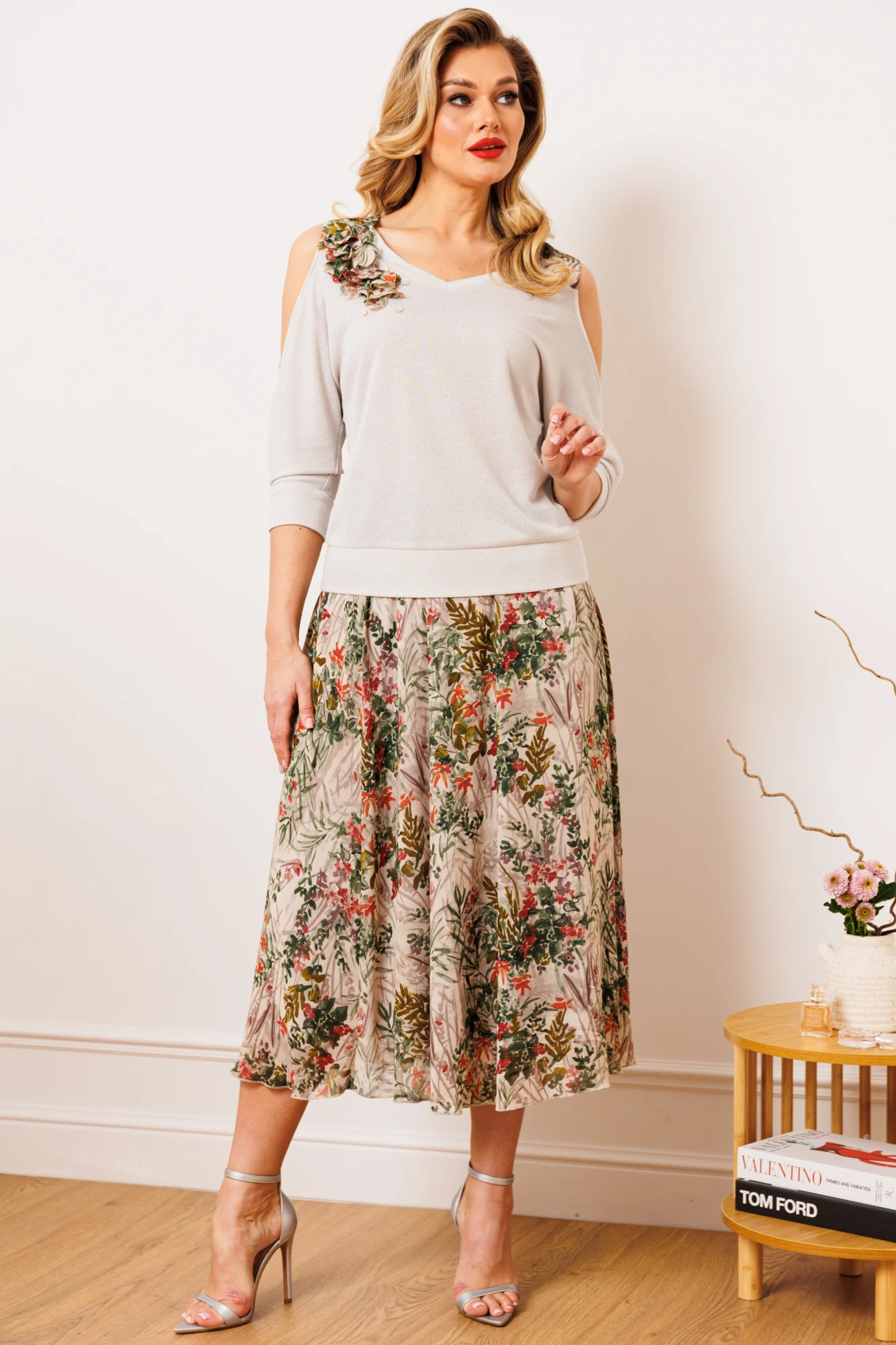 Шифоновая юбка в тандеме с блузоном. Блузон выполнен из трикотажного полотна. Перед и спинка с отрезными кокетками выполнеными из ткани юбки. Рукав цельнокройный с открытым плечом. Низ рукавов и низ блузона с притачной манжетой. Юбка полусолнце, сверху на притачном поясе с резинкой.