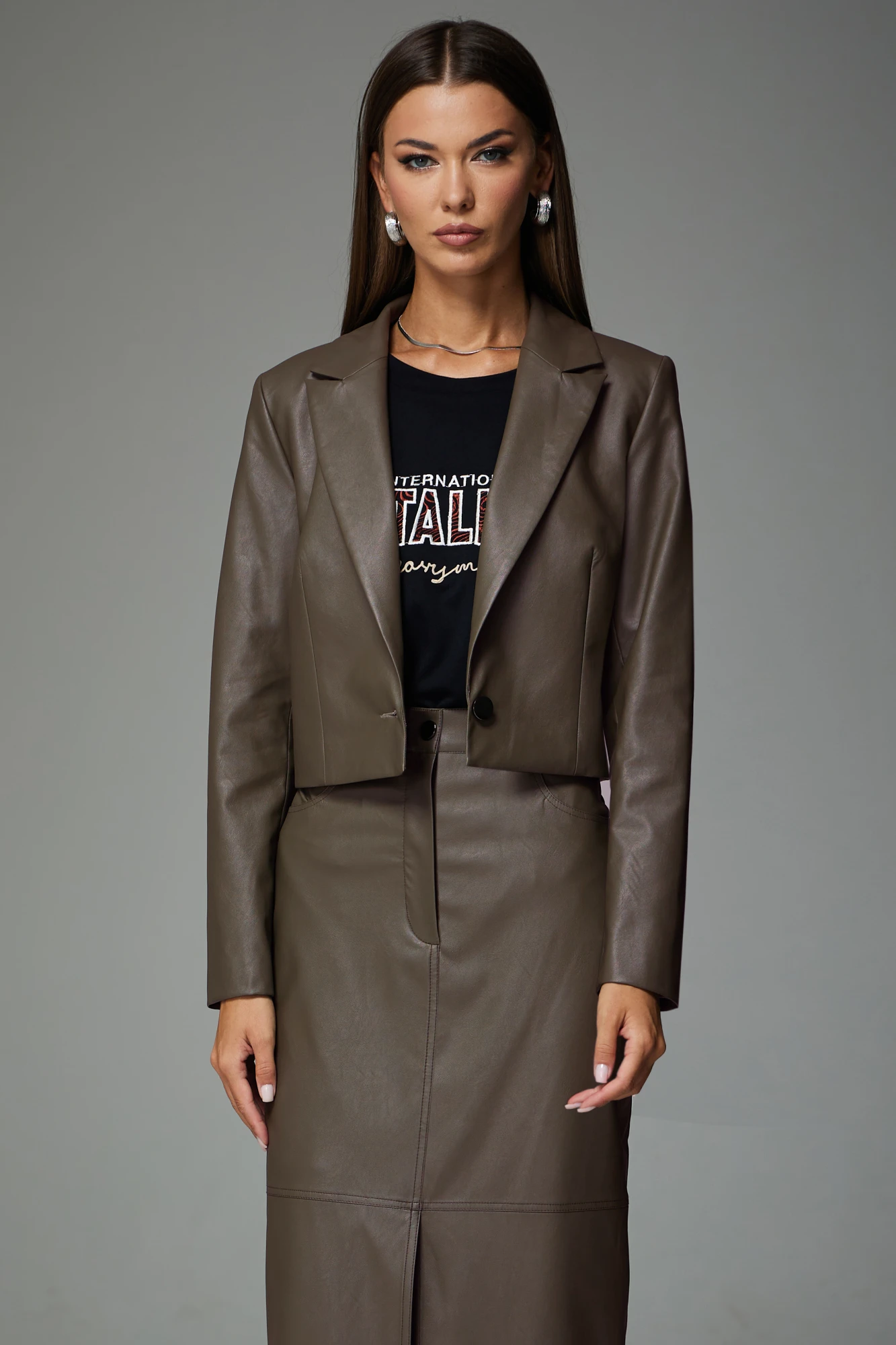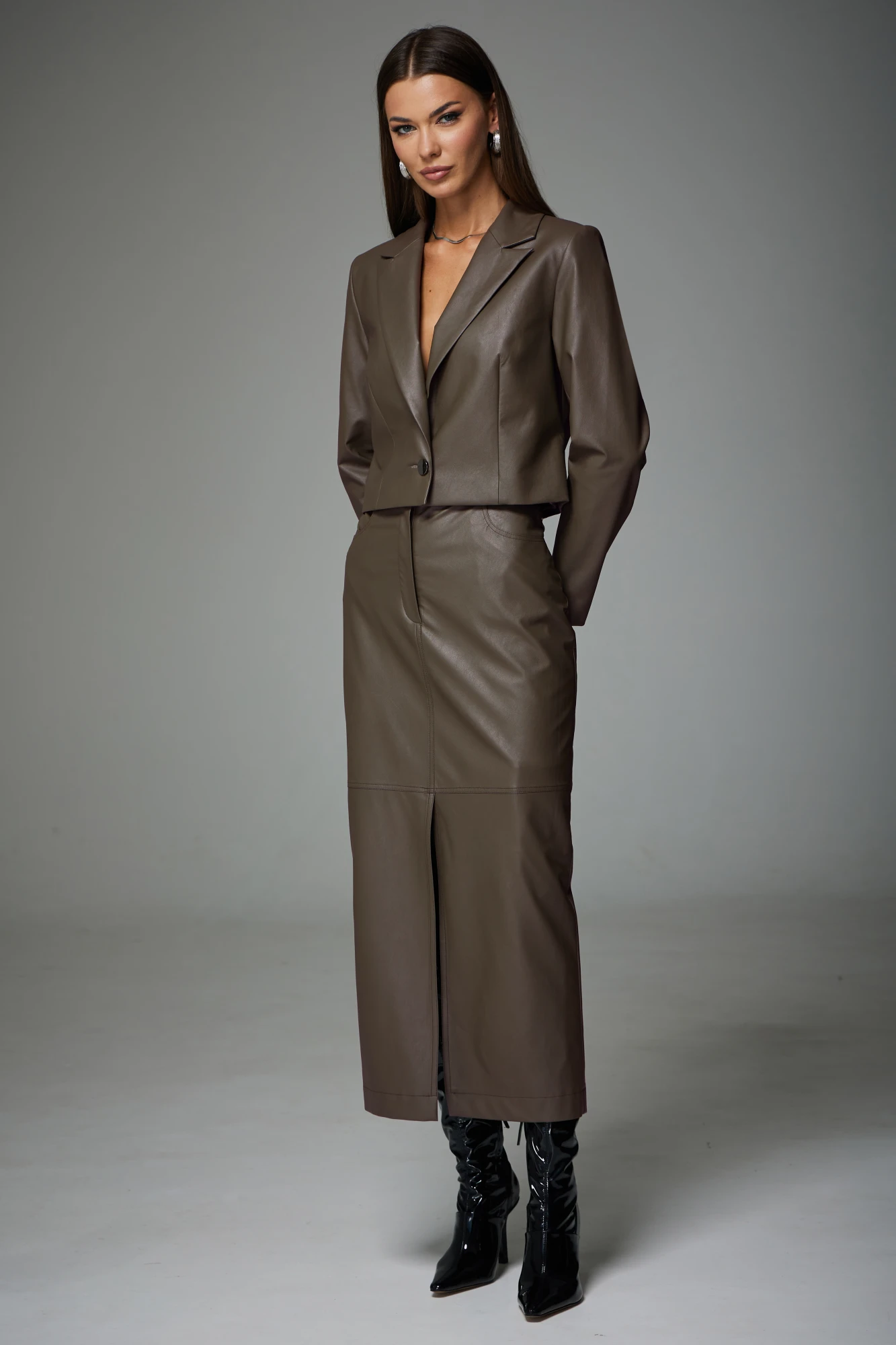 Юбка прямого силуэта, к низу заужена. Верхний срез обработан поясом со шлевками для ремня. По переду расположен средний шов с застежкой на гульфик (молния) и разрезом. На переднем и заднем полотнище имеется горизонтальный шов. В боковых швах переднего полотнища расположены карманы закругленной формы. Горизонтальные, вертикальные подрезы, застежка на гульфик, карманы и пояс со шлевками обработаны отделочными строчками.