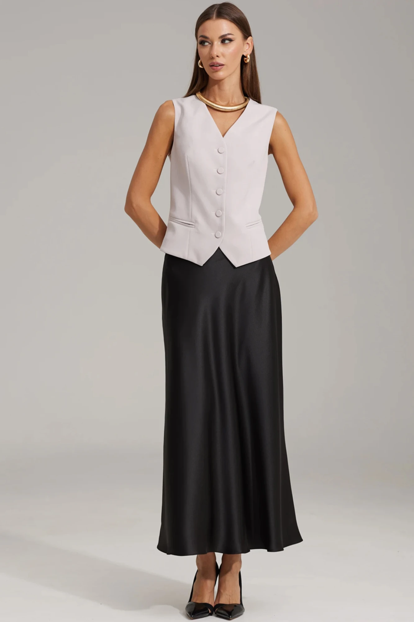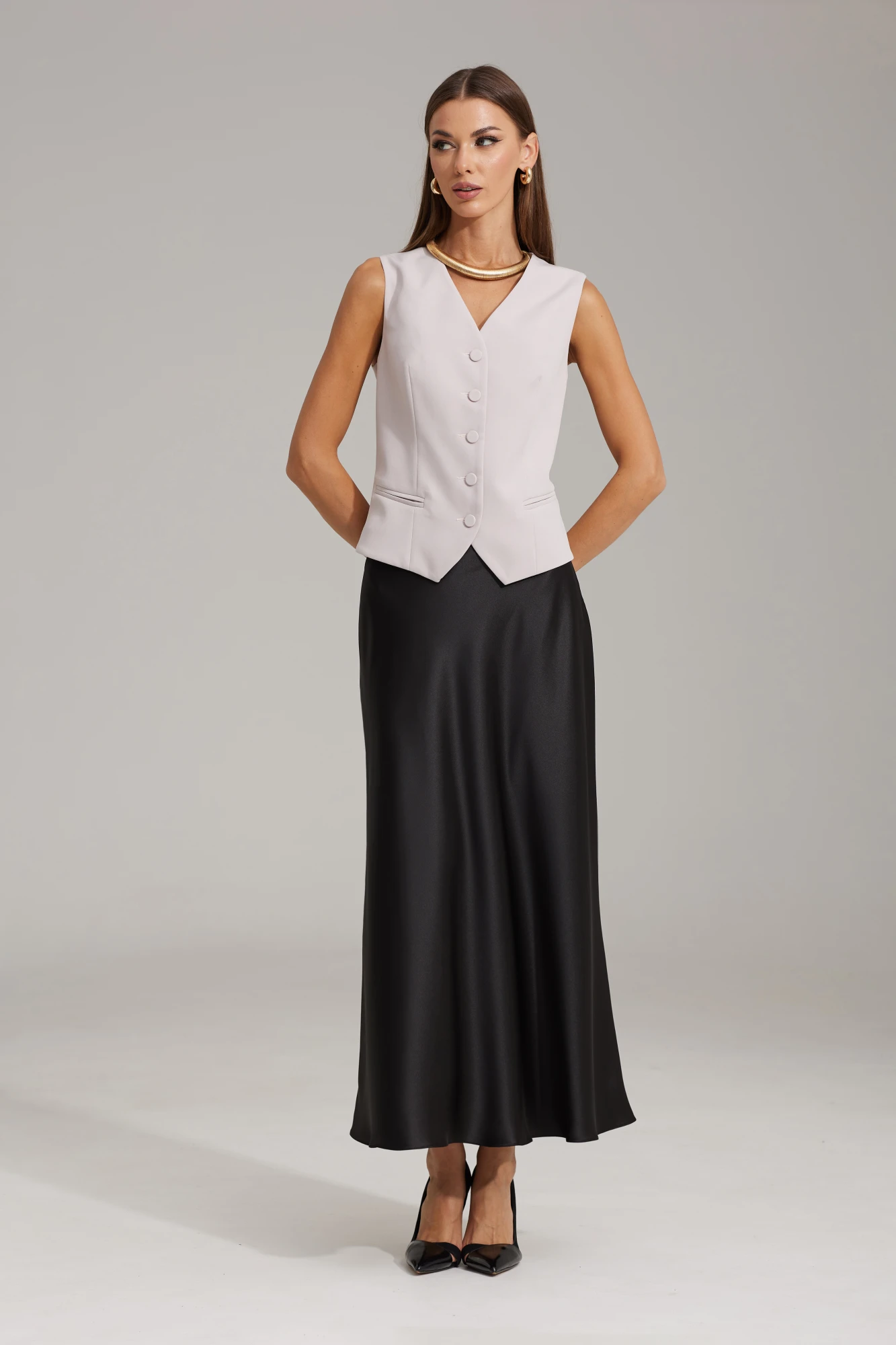 Юбка выполнена по косой, к низу расширена. Верхний срез на обтачке, по спинке талиевые вытачки, в левом боковом шве застежка на потайную тесьму-молнию.