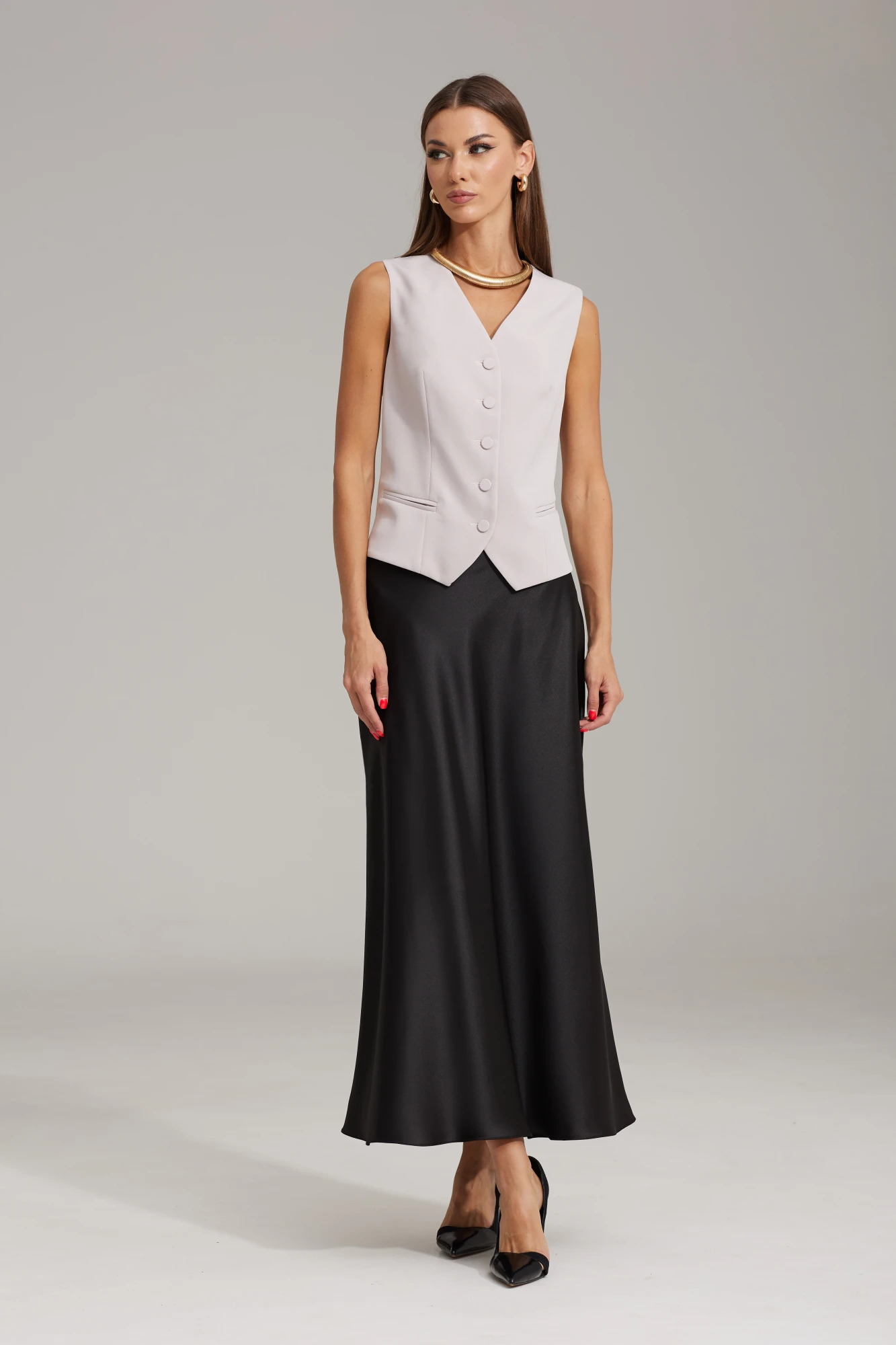 42,44,46,48,50, 52Жилет на подкладке, полуприлегающего силуэта из костюмной ткани, длиной до уровня бедер. Центрально-бортовая застежка на петли-пуговицы в цвет ткани. На деталях переда на уровне талии расположены прорезные карманы в рамку (имитация). Горловина V-образной формы. По переду низ изделия фигурный.