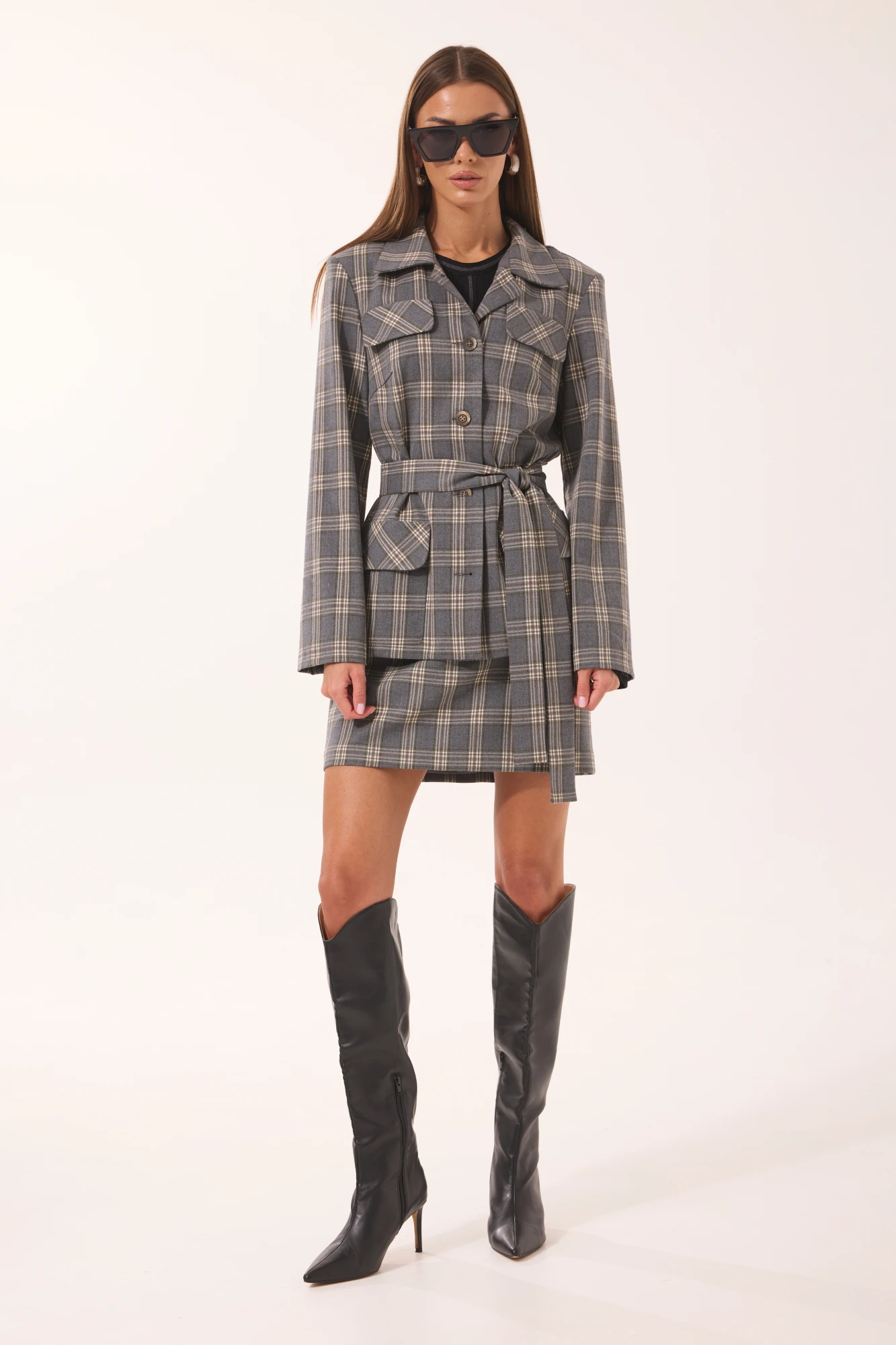 Жакет прямого силуэта с центрально-бортовой застежкой на пуговицы. Спинка прямая. Воротник пиджачного типа. Рукав длинный, одношовный, втачной. По переду жакета расположены нагрудные вытачки, идущие из бокового шва. По низу переда – накладные карманы с клапаном (клапан выполнен по косой). В верхней части переда настрочен отделочный клапан (по косой). Застежка до верха, с отложным воротником. В комплект входит съемный пояс.