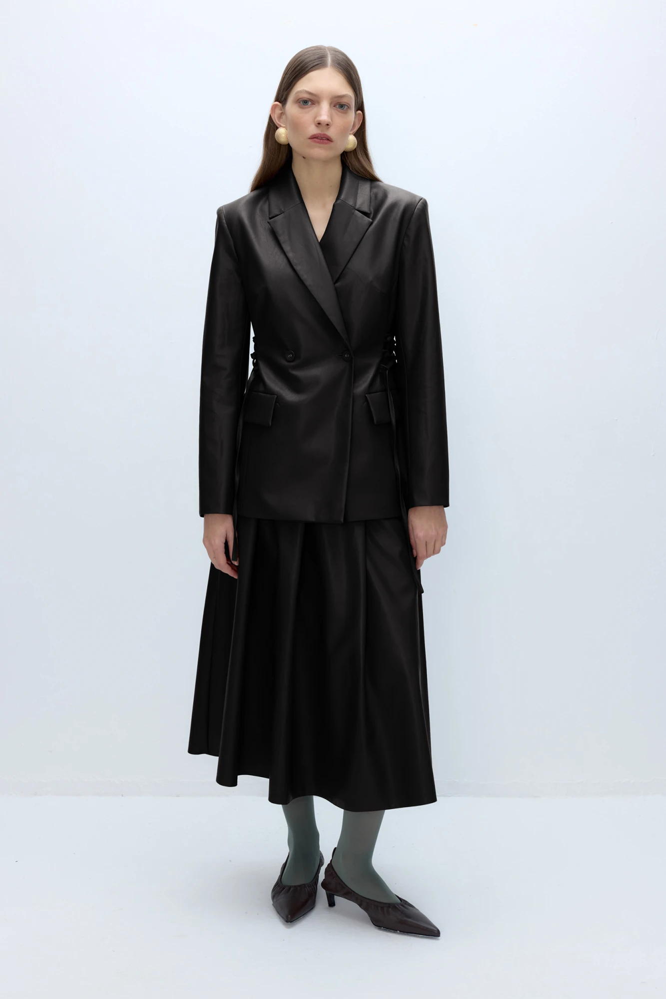 Детали: жакет полуприлегающего силуэта, рельефы, пиджачный воротник, застежка на две петли и пуговицы, функциональные карманы, жакет на подкладке. Жакет также можно зашнуровать по бокам. Юбка на притачном поясе со шлевками, прорезные карманы, застежка на потайную молнию в левом боковом шве, юбка на подкладке.