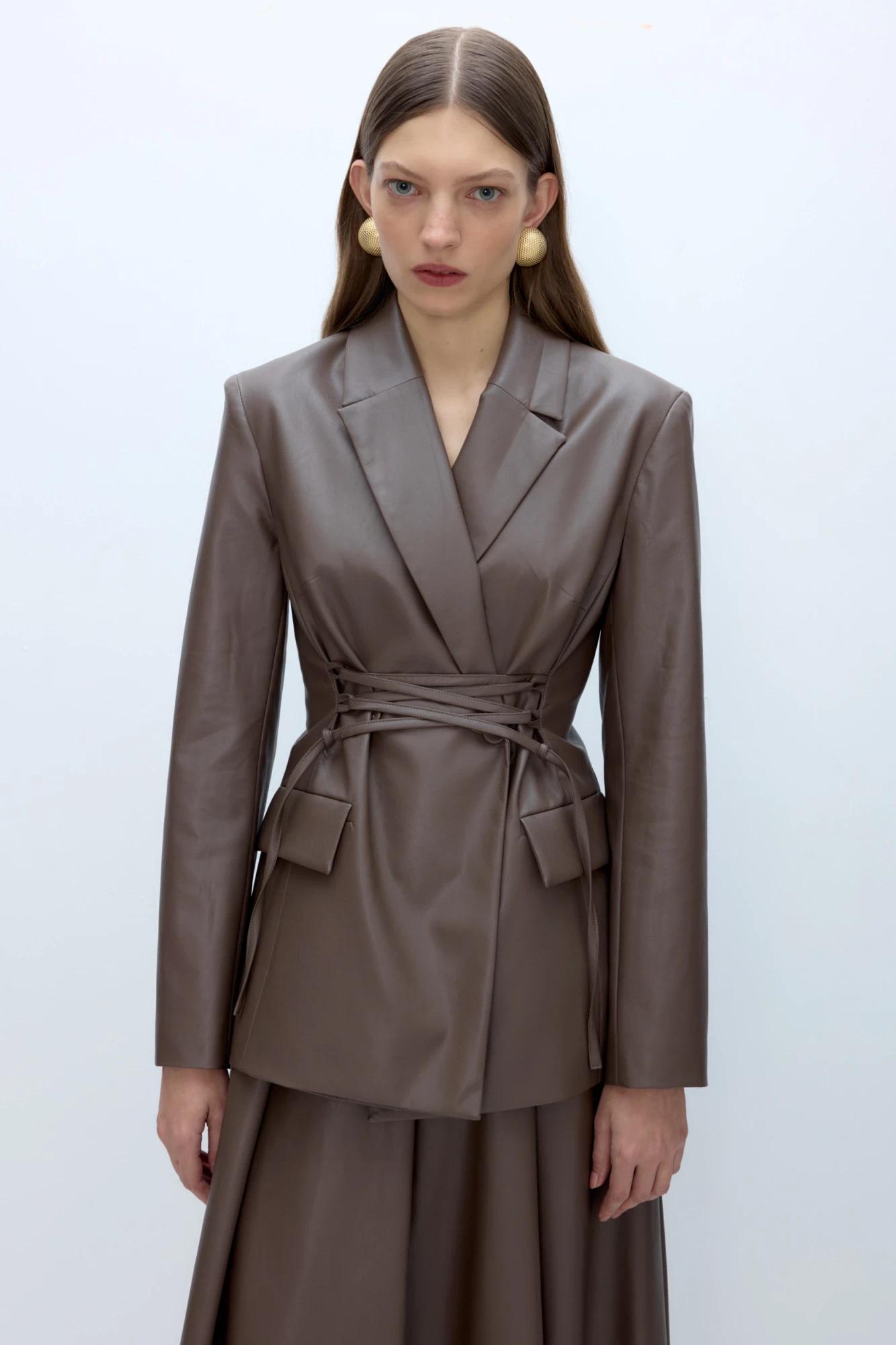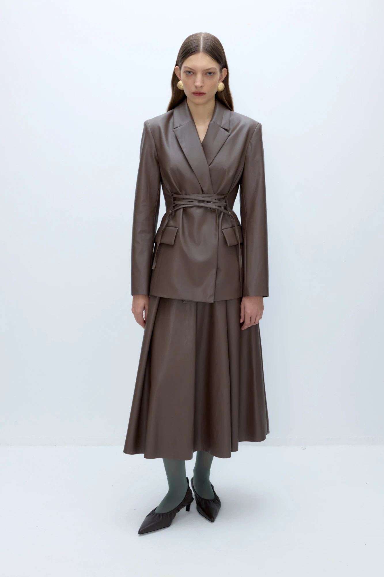 Детали: жакет полуприлегающего силуэта, рельефы, пиджачный воротник, застежка на две петли и пуговицы, функциональные карманы, жакет на подкладке. Жакет также можно зашнуровать по бокам. Юбка на притачном поясе со шлевками, прорезные карманы, застежка на потайную молнию в левом боковом шве, юбка на подкладке.