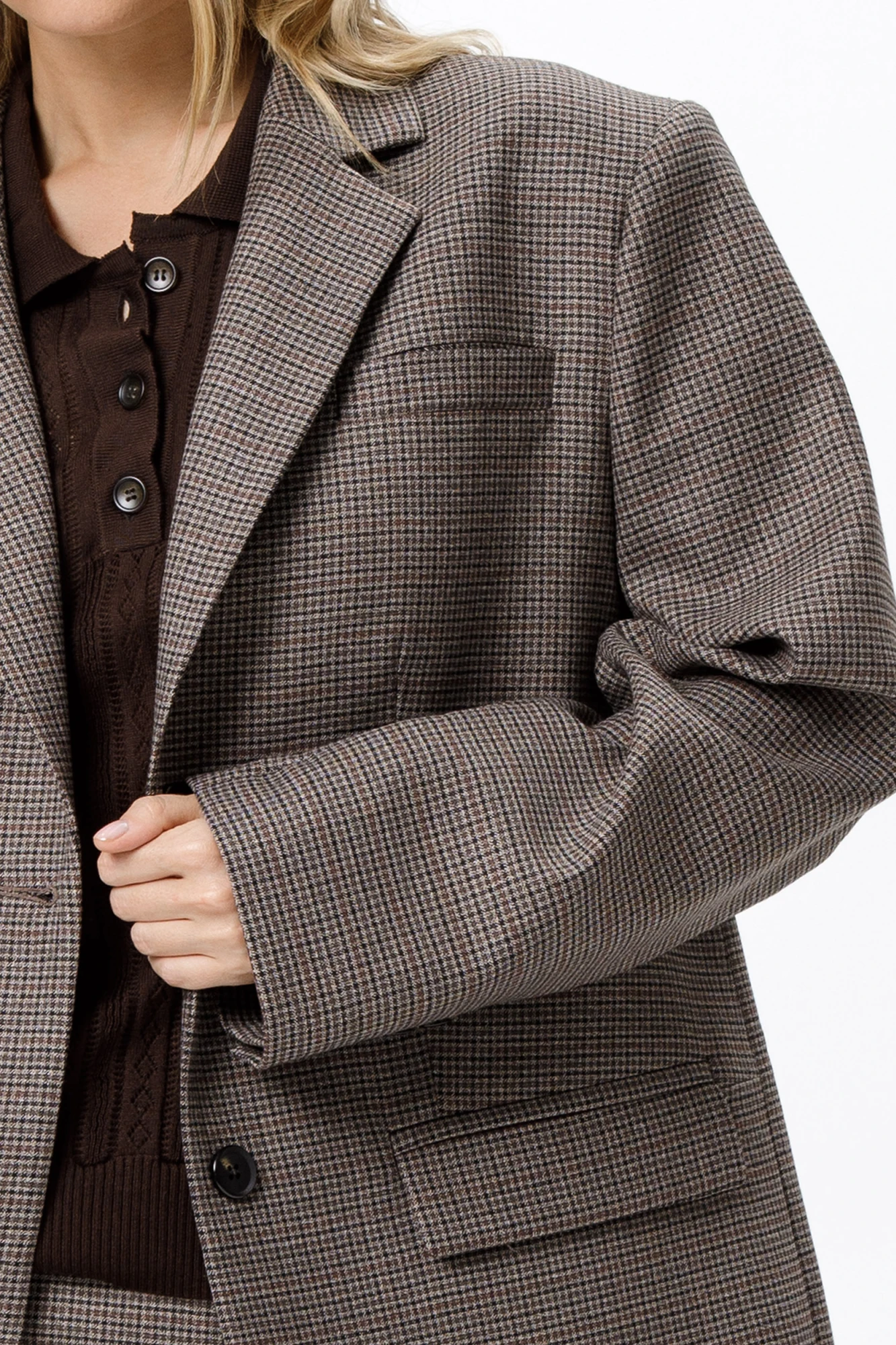 Детали: жакет прямого силуэта, расширенная линия плеч, пиджачный воротник, перед с функциональными карманами, однобортная застежка на петли и пуговицы, спинка со средним швом и шлицей, рукава втачные двухшовные, жакет на подкладке. Юбка на притачном поясе, застежка сзади на потайную молнию, юбка на подкладке.