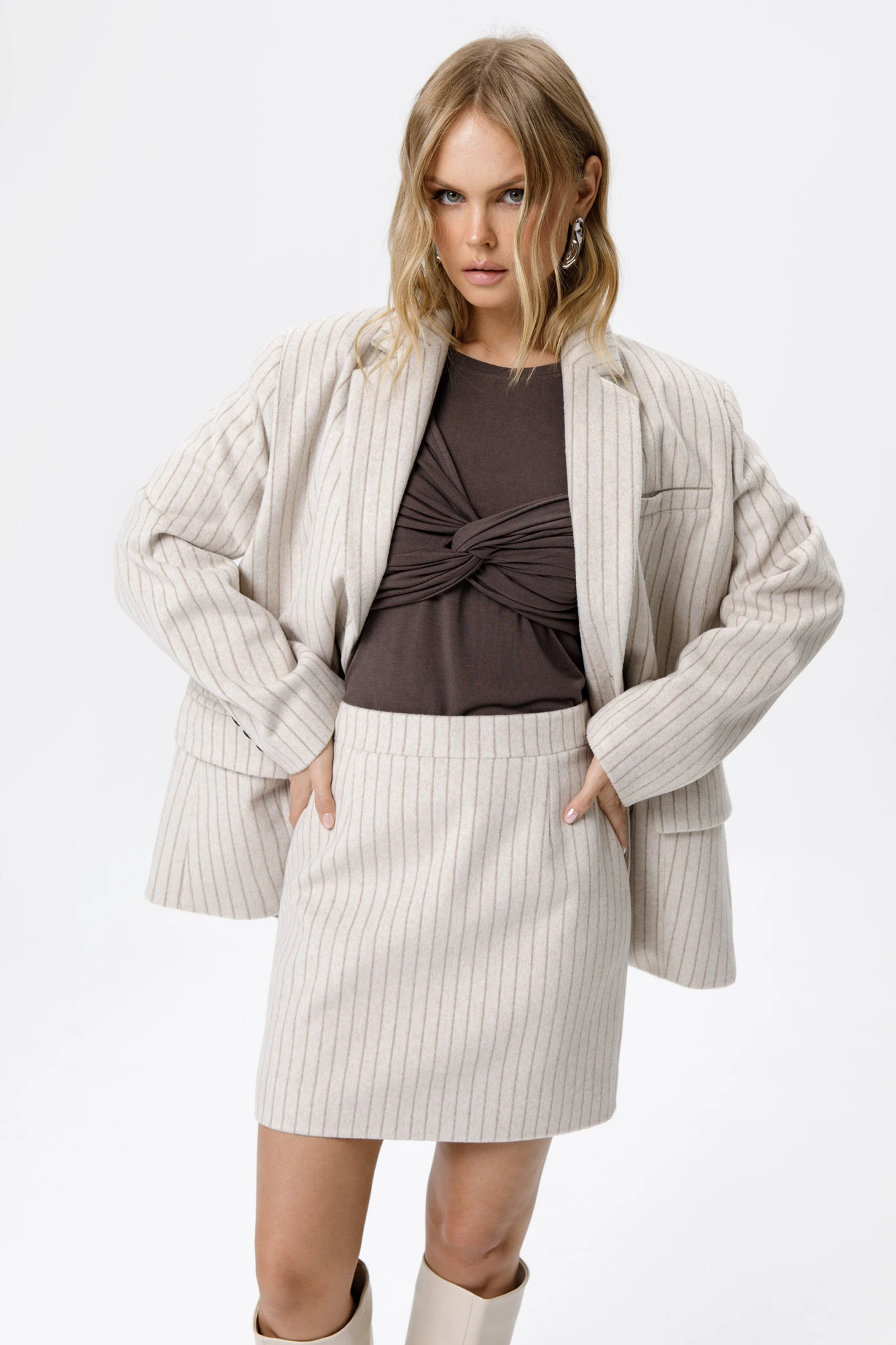 Длина жакета по спинке около 69 см в размерах 40-46 и около 72 см в размерах 48-52, длина рукавов около 62 см. Длина юбки по боковому шву с поясом около 46 см в размерах 40-46 и около 49 см в размерах 48-52 см