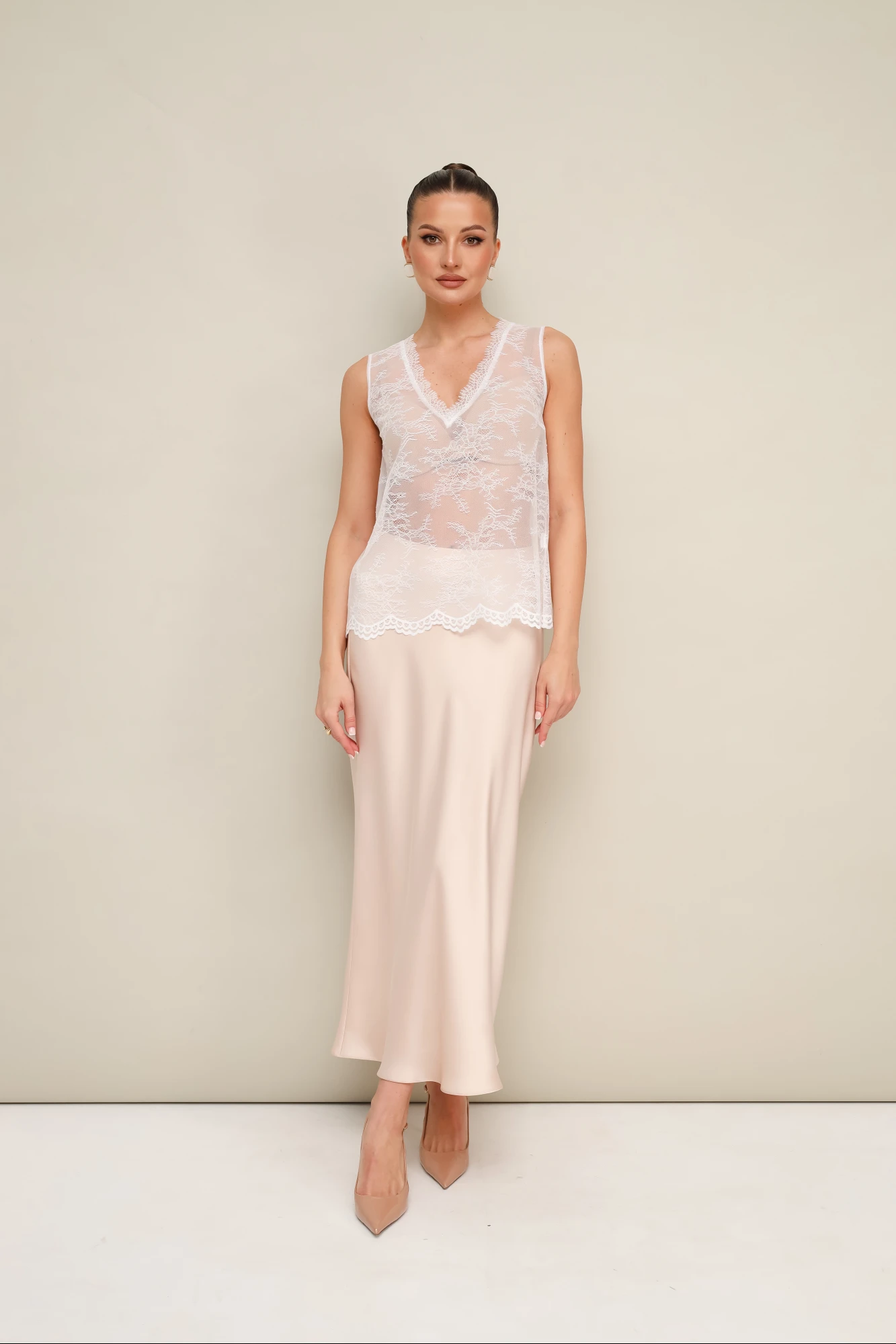 Топ прямого силуэта, выполнен из изысканного французского кружева. V-образный вырез горловины обработан кружевной отделкой. Юбка с кроем «по косой» в длине миди, пояс на обтачке, застежка в боковом шве на потайную тесьму молнию.