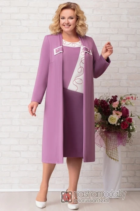 Описание: Комплект женский, состоящий из кардигана и платья. Комплект выполнен из приятного на ощупь эластичного трикотажа. Кардиган свободный; без застежки; без подкладки; с плечевыми накладками; с отворачивающимися на лицевую сторону бортами, которые закладываются на плече в одностороннюю складку. На уровне груди борта зафиксированы двойными патами с пуговицей. Перед с нагрудной вытачкой. Спинка со средним швом. Длина по центру спинки 112 см. Рукава втачные, одношовные. Длина рукава 60 см. Горловина спинки обработана обтачкой. Платье полуприлегающего силуэта, с плечевыми накладками. Перед с боковыми частями от пройм, с косым подрезом по линии бедер от правого бокового шва до левого бочка. Левая боковая часть до низа изделия, правая – до линии подреза. Центральная часть переда состоит из двух асимметричных деталей, на одной из которых вышивка шнуром. Такая же вышивка украшает широкую планку горловины. Спинка с вытачками и средним швом, оканчивающимся шлицей. Длина по центру спинки 110 см. Рукава втачные, одношовные, короткие. Длина рукава 21 см. Горловина круглой формы, обработана обтачкой. Платье и кардиган без подкладки