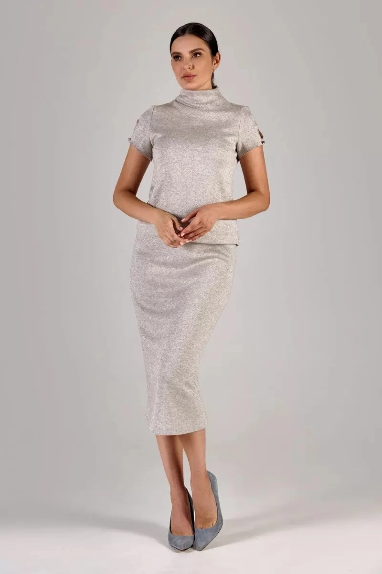 Комплект из мягкого трикотажного полотна с люрексовой нитью, которая придает небольшой блеск. Комплект состоит из джемпера и юбки полуприлегающего силуэта. Джемпер с цельнокроеным воротником- стойкой, на рукавах декоративная капелька. Юбка прямого силуэта, зауженная к низу, шлица по среднему шву, пояс на резинке.