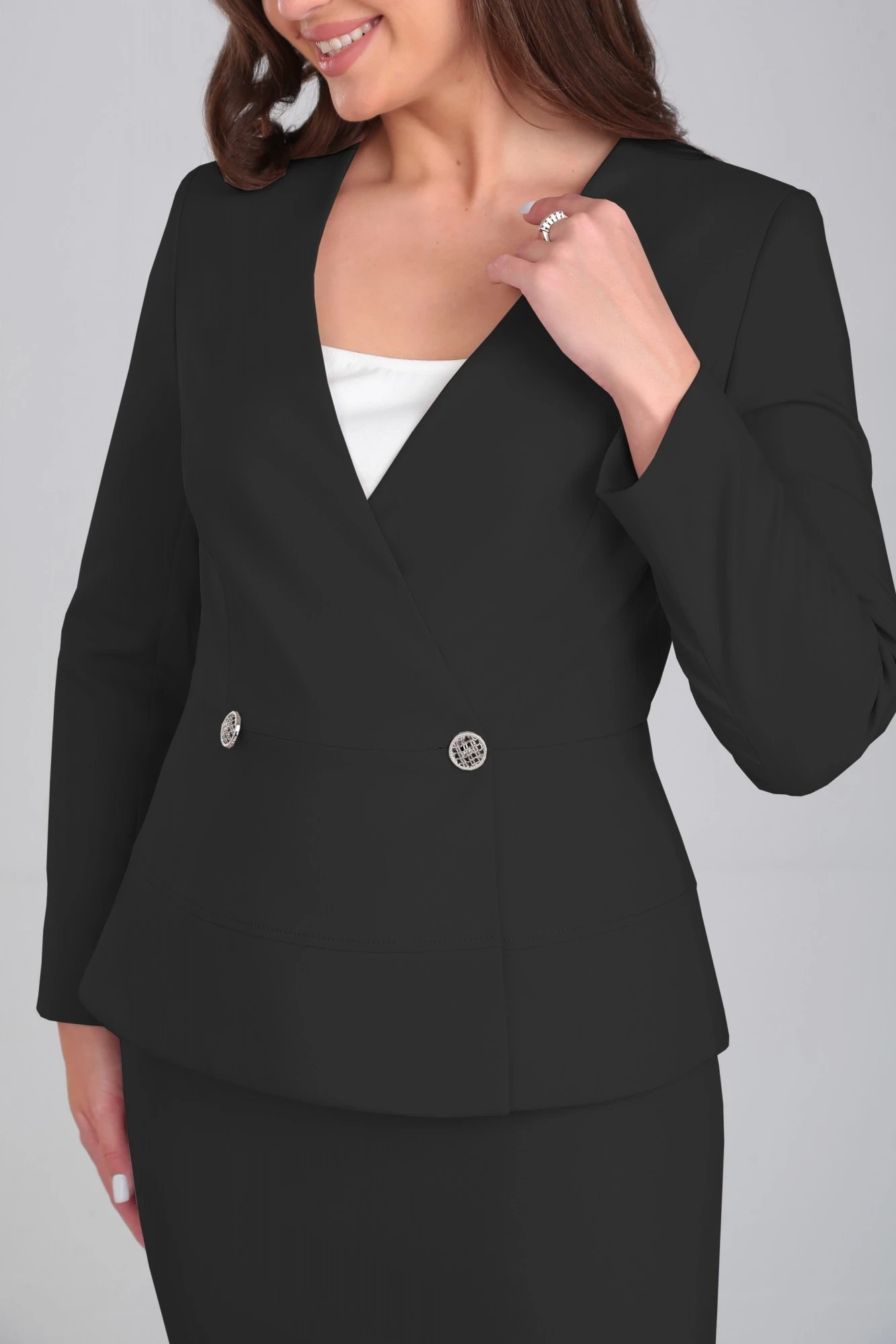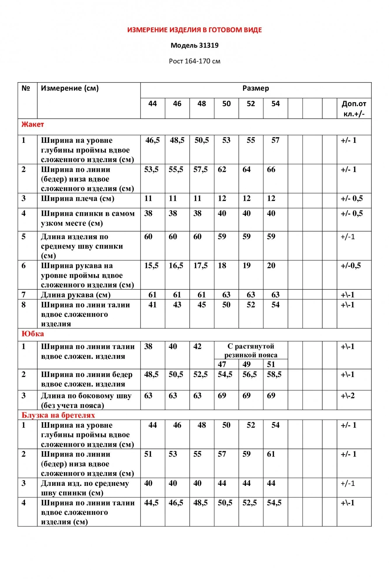 Юбка на подкладке, прямая, немного зауженная к низу, на прямом поясе, со шлицей. В размерах 44-48 пояс без резинки, в размерах 50-54 по бокам вставлена резинка. Застежка на потайную тесьму-молнию в среднем шве заднего полотнища. Топ на узких регулируемых бретелях.