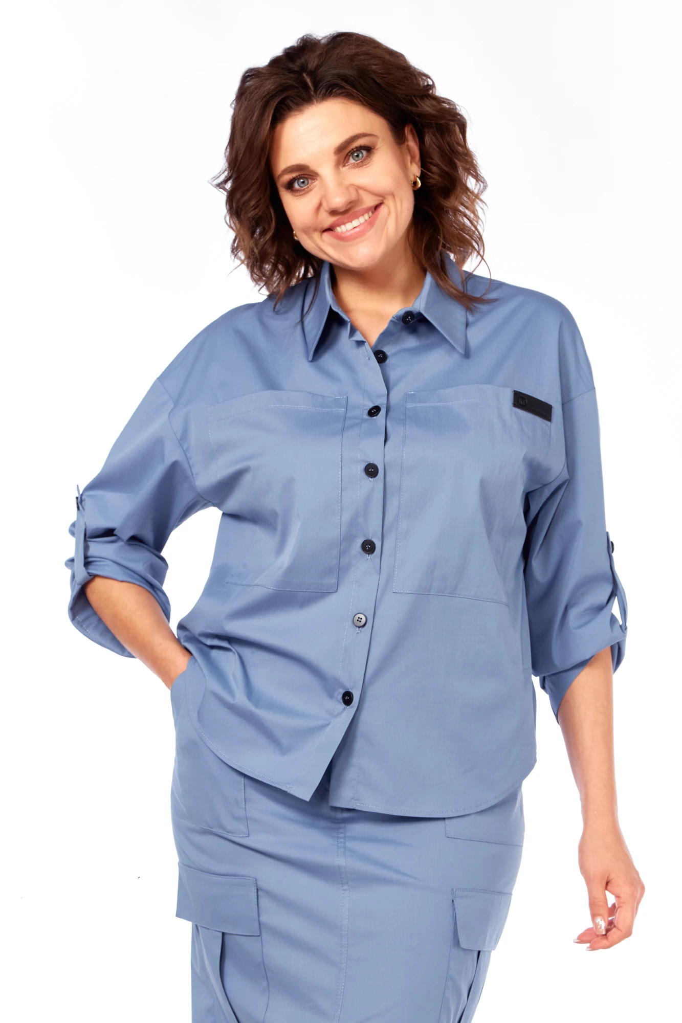 Рубашка свободного кроя со спущенным рукавом длиной ¾ и центральной застежкой на петли-пуговицы. Воротник стояче-отложной с отрезной стойкой. По полочкам расположены накладные карманы.
