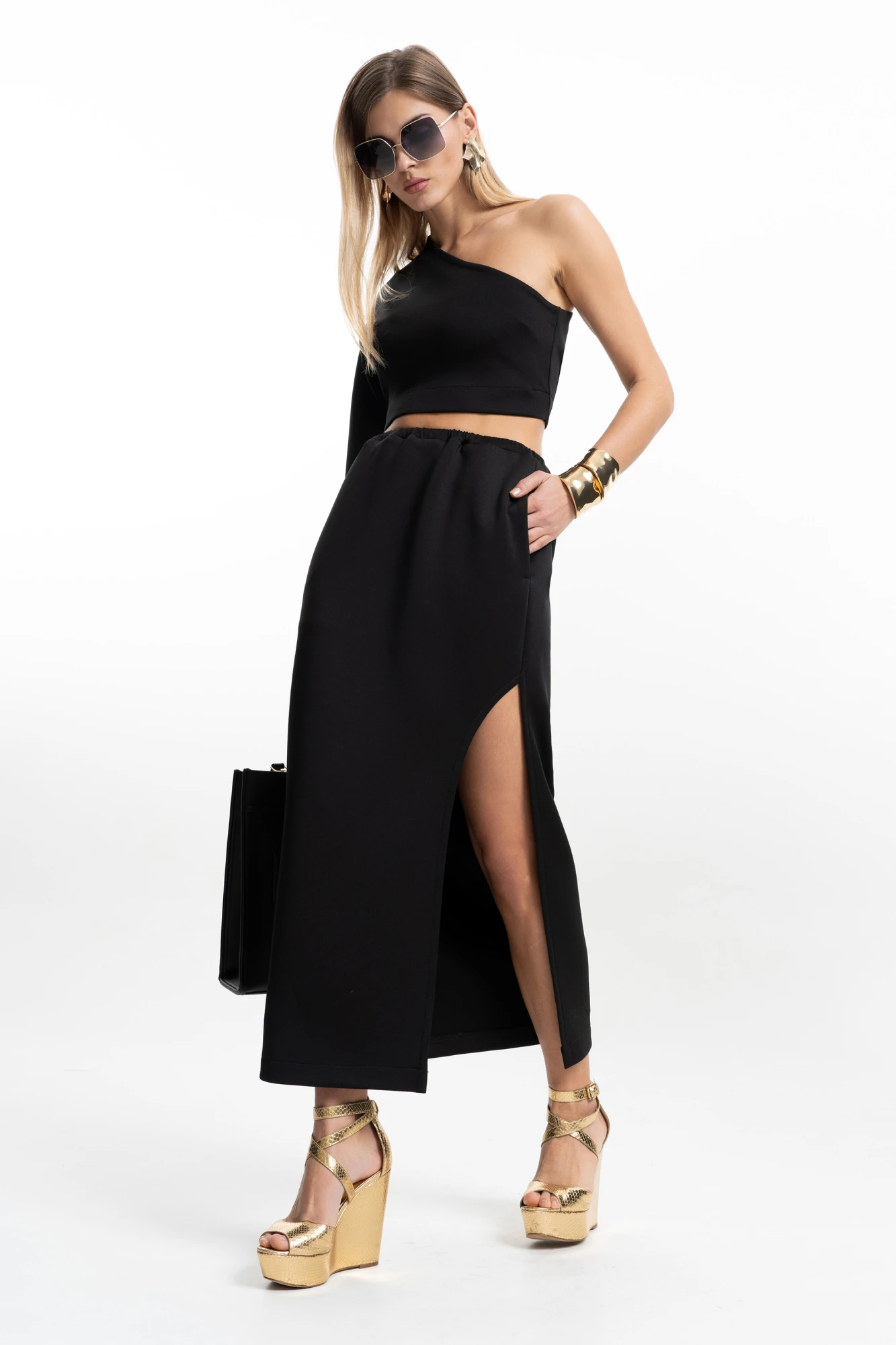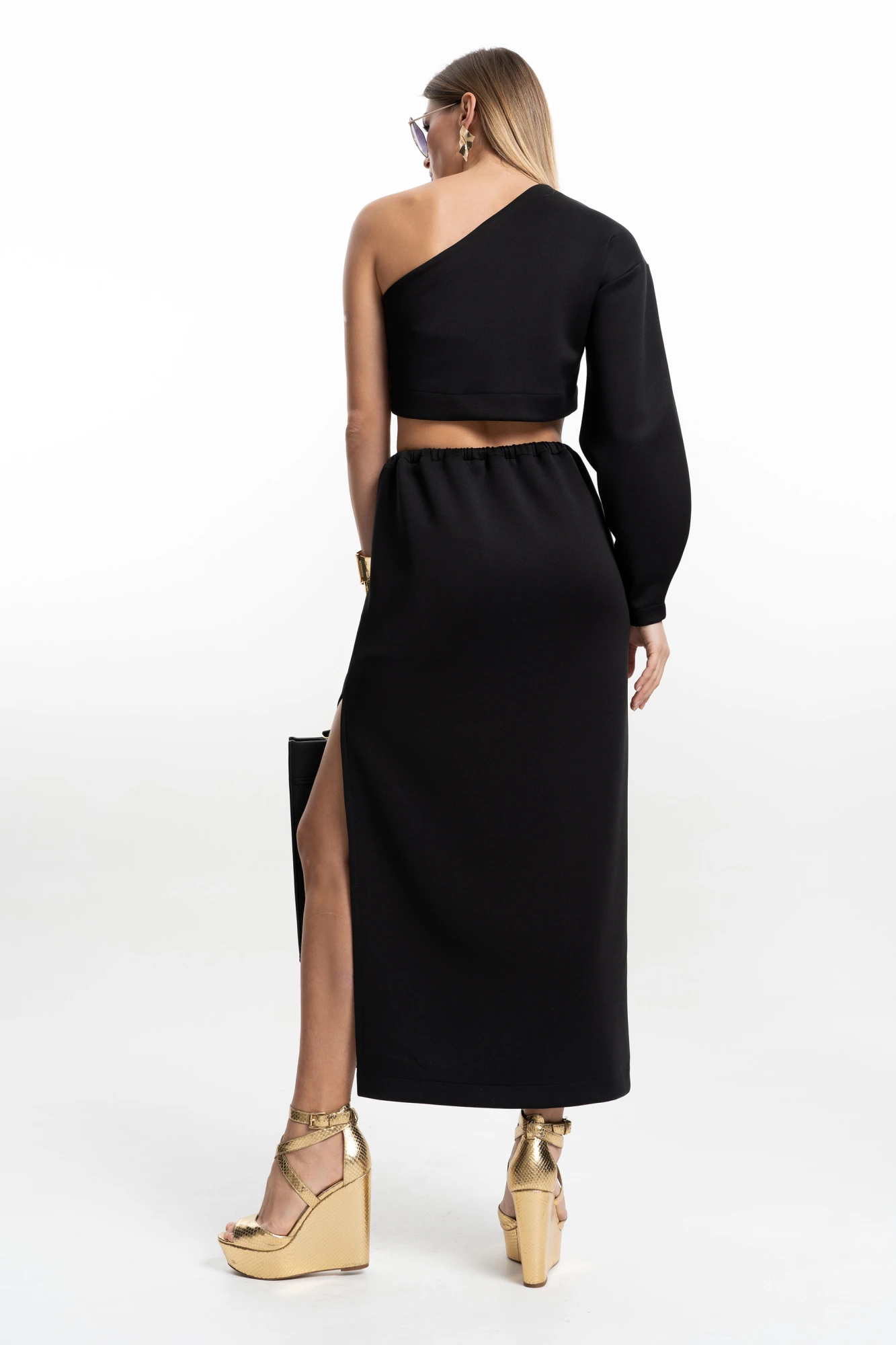 Длина джемпера по спинке от плеча 39 см. Длина рукава от горловины 73 см.Длина юбки по боковому 91 см. Высота разреза от линии талии 36 см.