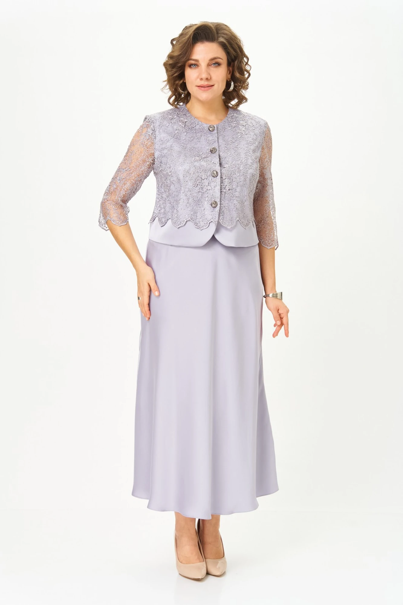 Жакет атласный украшенный кружевом полуприлегающего силуэта с втачным рукавом. Горловина округлой формы. Застежка центральная на 4 обметанные петели и пуговицы. Перед с вытачками по линии груди. Перед и спинка жакета на подкладке. Рукав из кружева длиной ¾, придает образу легкость и воздушность.