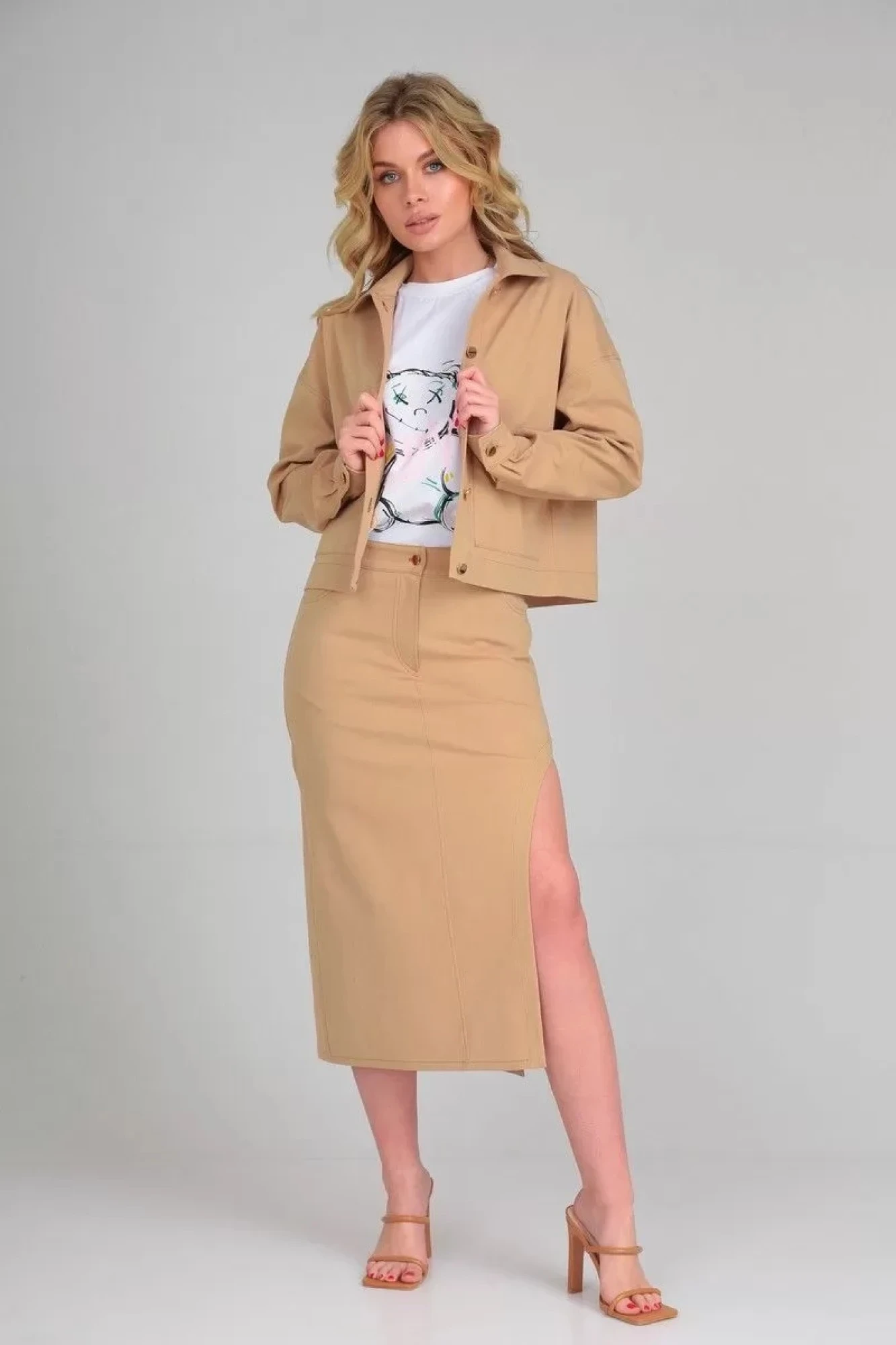 Юбка из тонкой джинсовой ткани четырехшовная, с карманами, гульфиком с застежкой-«молнией», на поясе с застежкой на петли и пуговицы. На левом полотнище скругленный подрез от середины бедра.