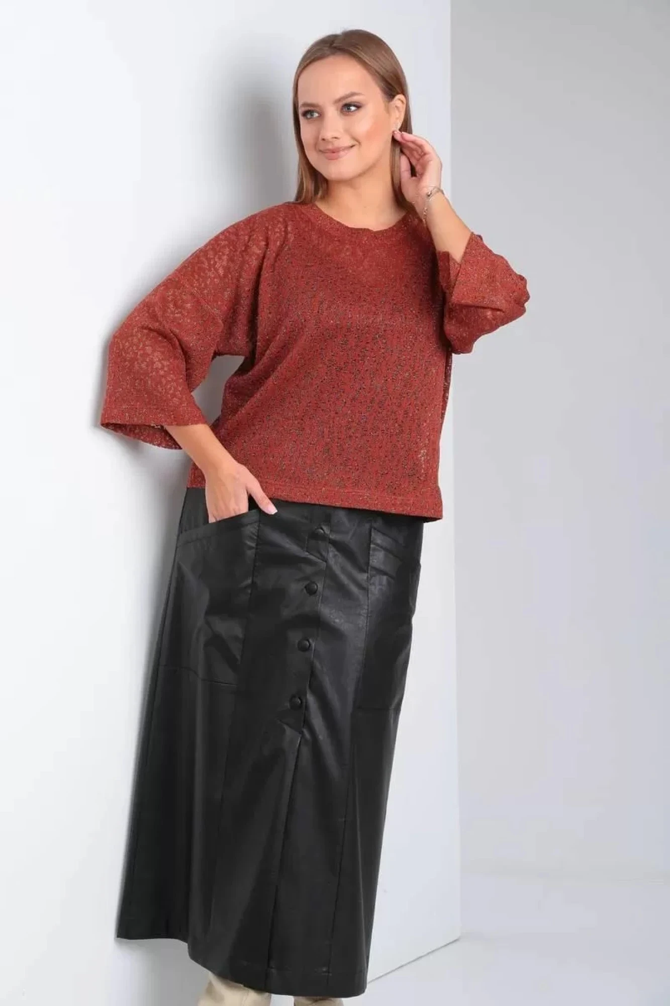 Юбка миди А-силуэта выполнена из экокожи на хлопке. Юбка на подкладке, с поясом, частично на резинке. По переду имитация застежки на петли и пуговицы. Функциональная застежка только верхние 3-и пуговицы. В боковой части функциональные карманы. По спинке вертикальные рельефы.