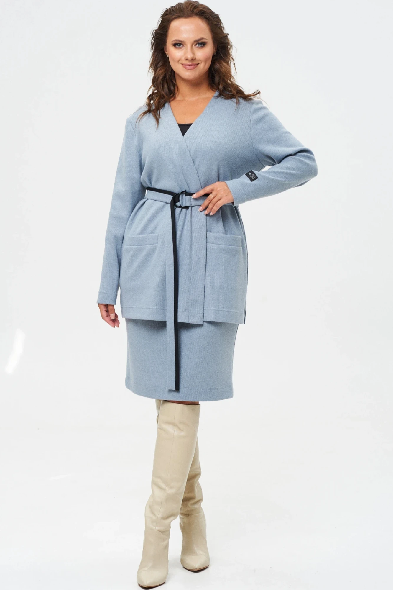 Кардиган с поясом, комбинированным из контрастной ткани, с пряжкой на полукольцах. Вырез горловины V-образный.