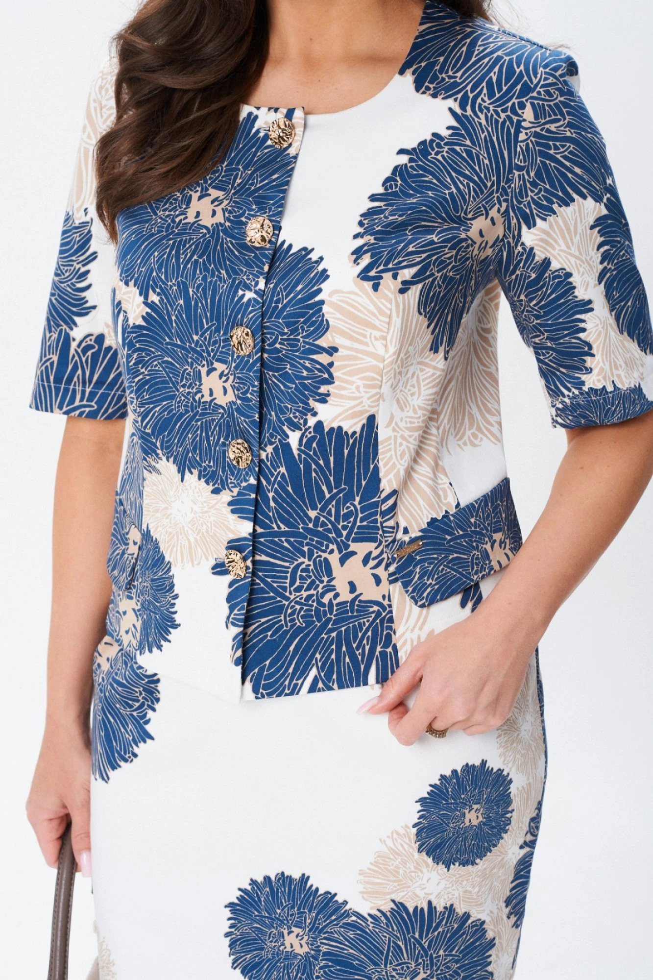 Жакет прямого силуэта, без подкладки с застёжкой на петли пуговицы. Рукав короткий. По переду декоративные клапаны.