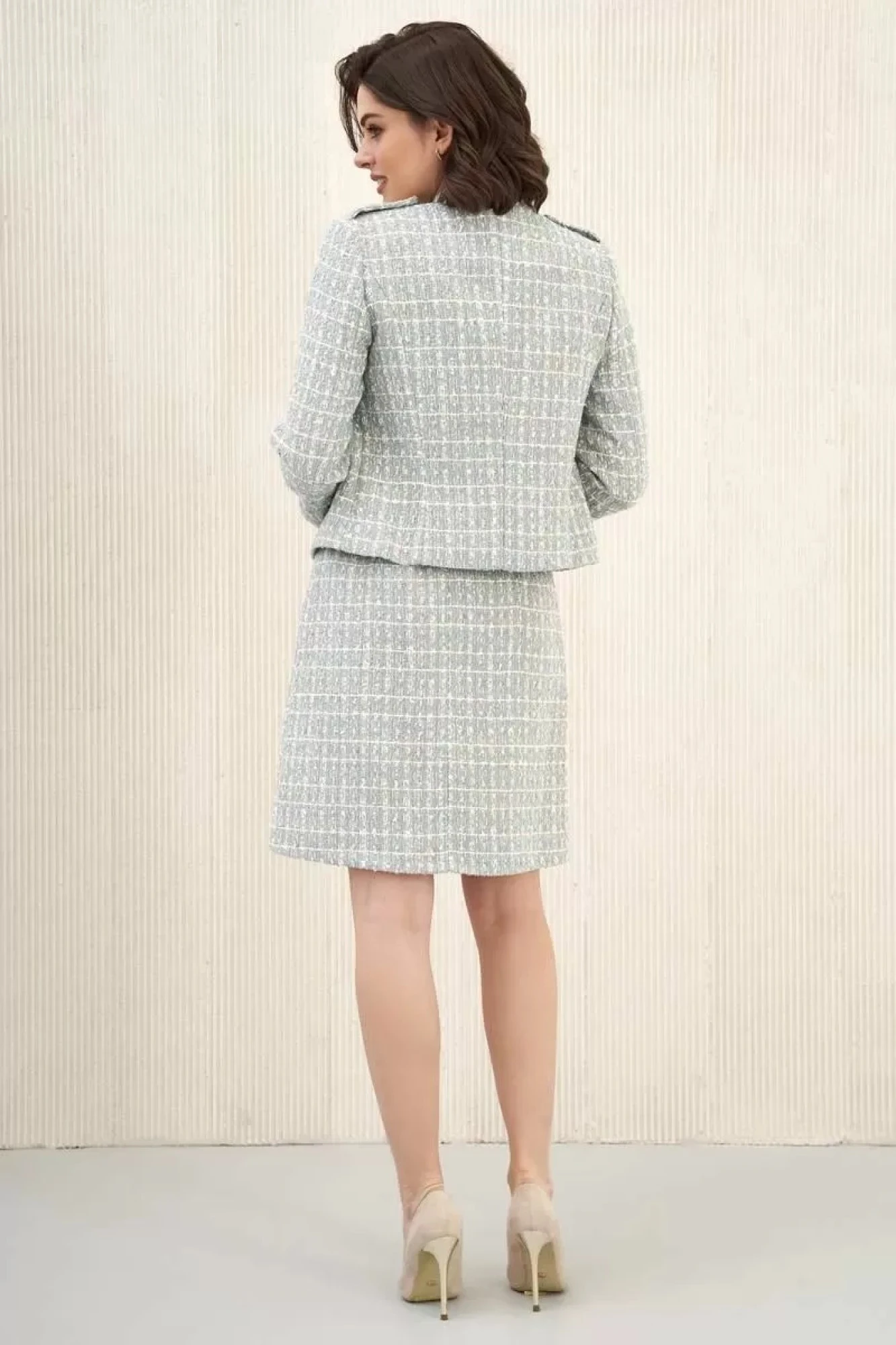 44,46,48, 50 ,52,54Жакет женский укороченный, без застежки с шестью декоративными пуговицами, расположенными параллельно борту и погонами по плечевым швам. Погоны закреплены пуговицей и имеют прямые углы. Перед с нагрудной вытачкой, выходящей из бокового шва. Спинка с рельефными швами, выходящими из проймы до низа и средним швом. Рукава втачные двухшовные, длинные. Горловина круглой формы, обработана воротником-стойкой.