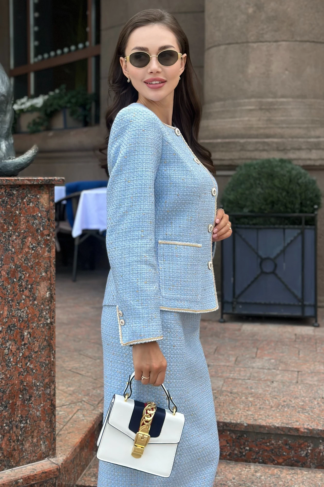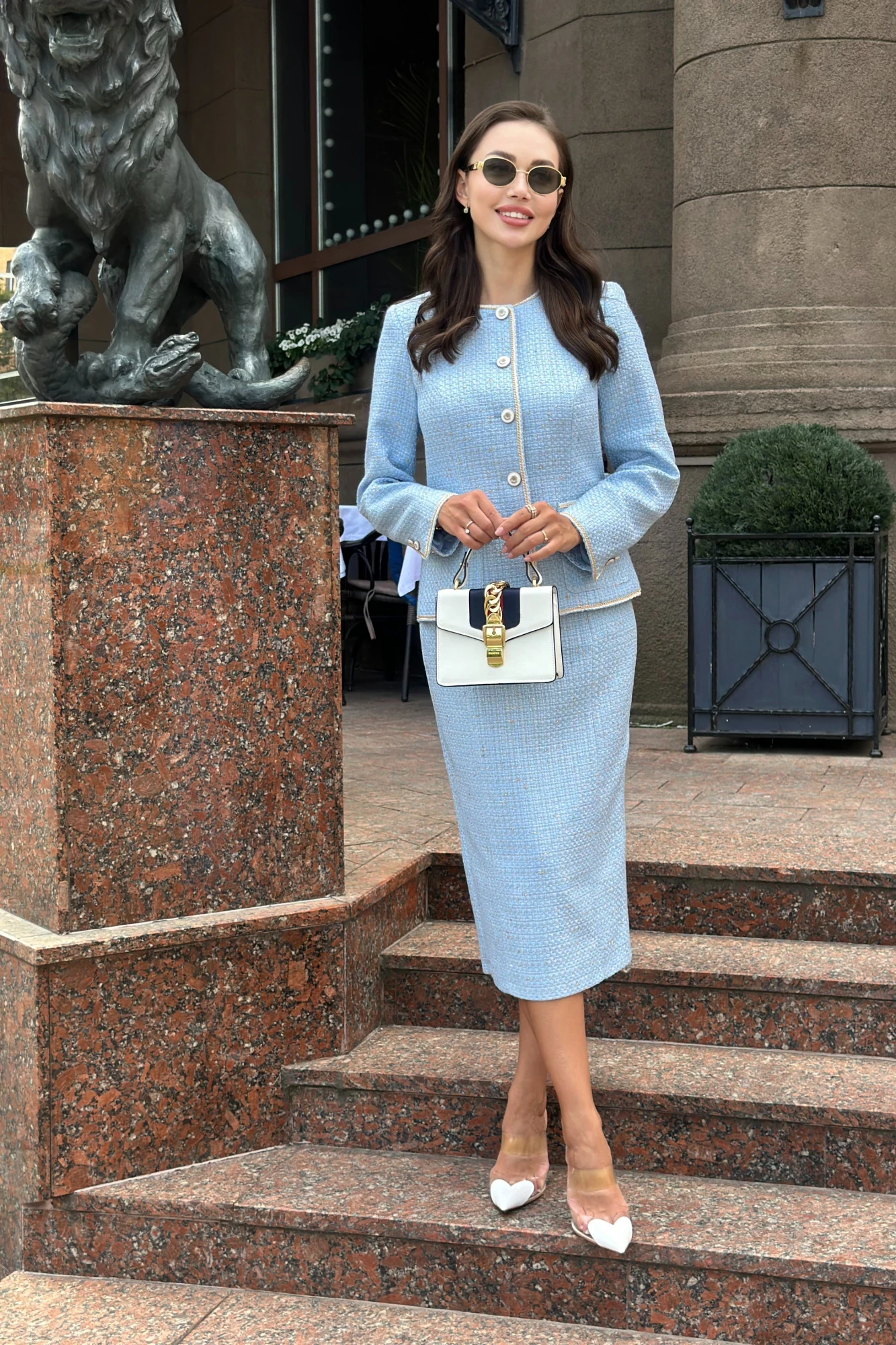 Костюм женский из костюмно-плательной ткани типа Chanel, состоит из жакет полуприлегающего силуэта на подкладке, и юбки-карандаш на подкладке. Костюм может использоваться и как нарядный, так и для повседневной носки.
