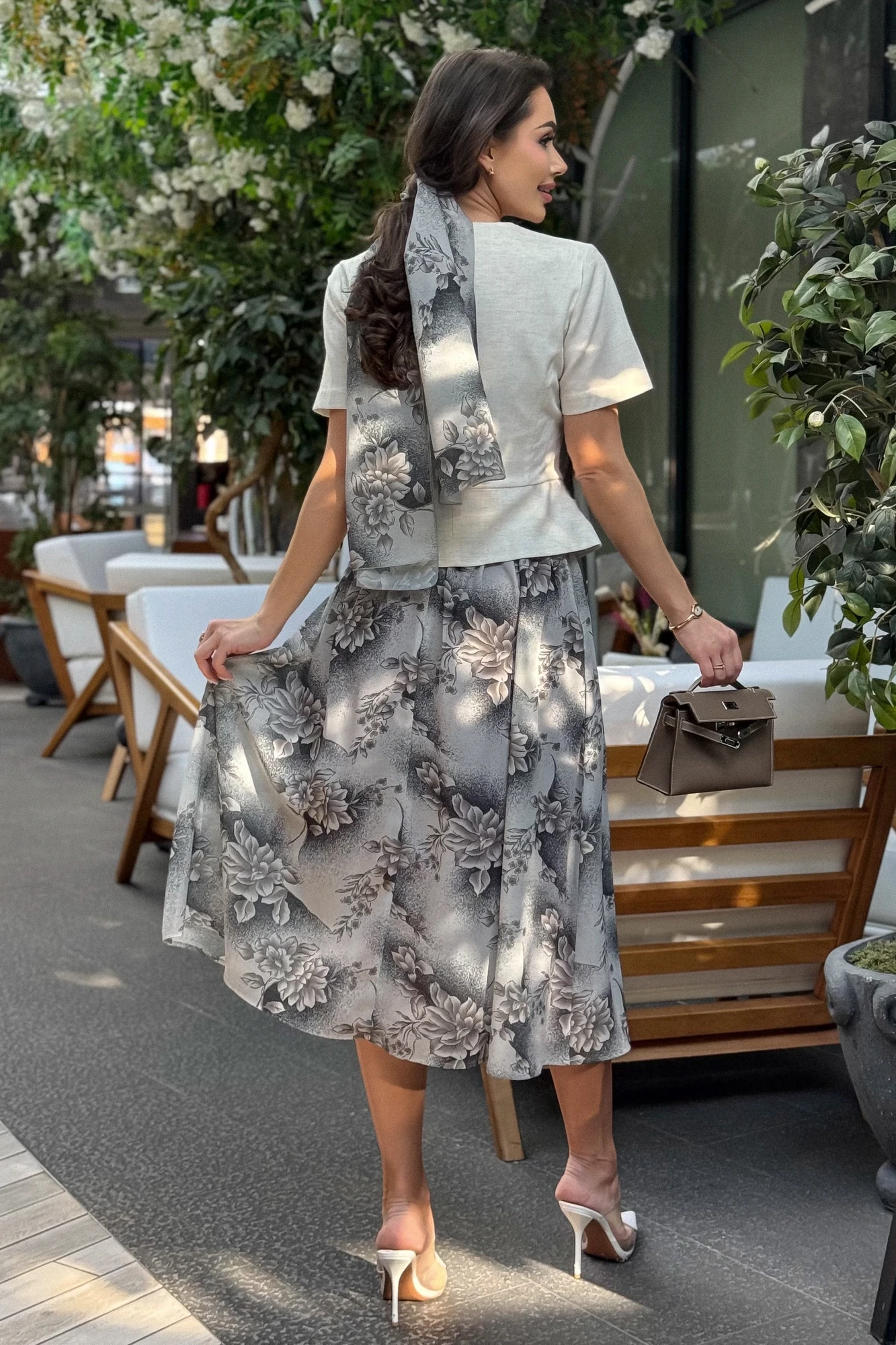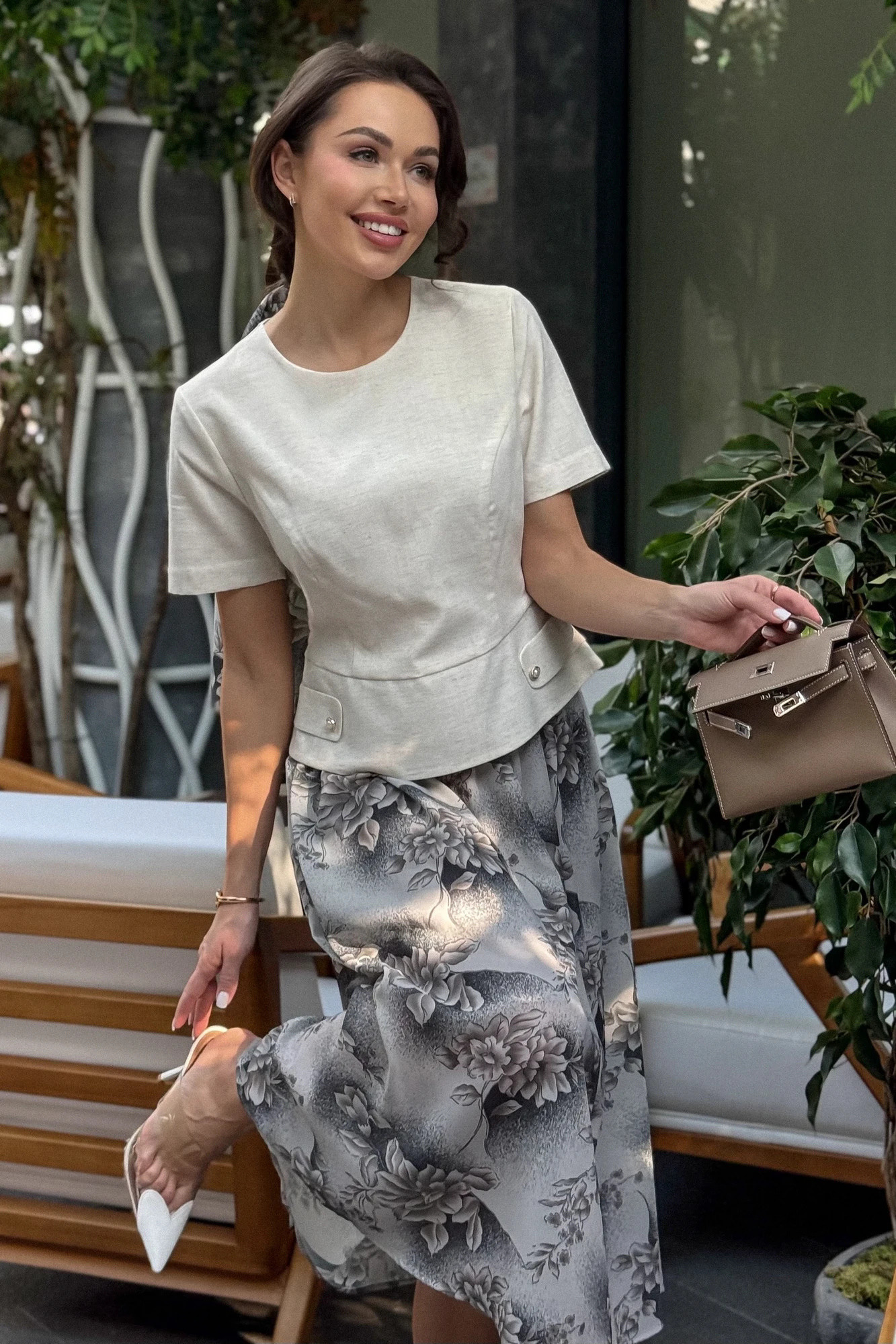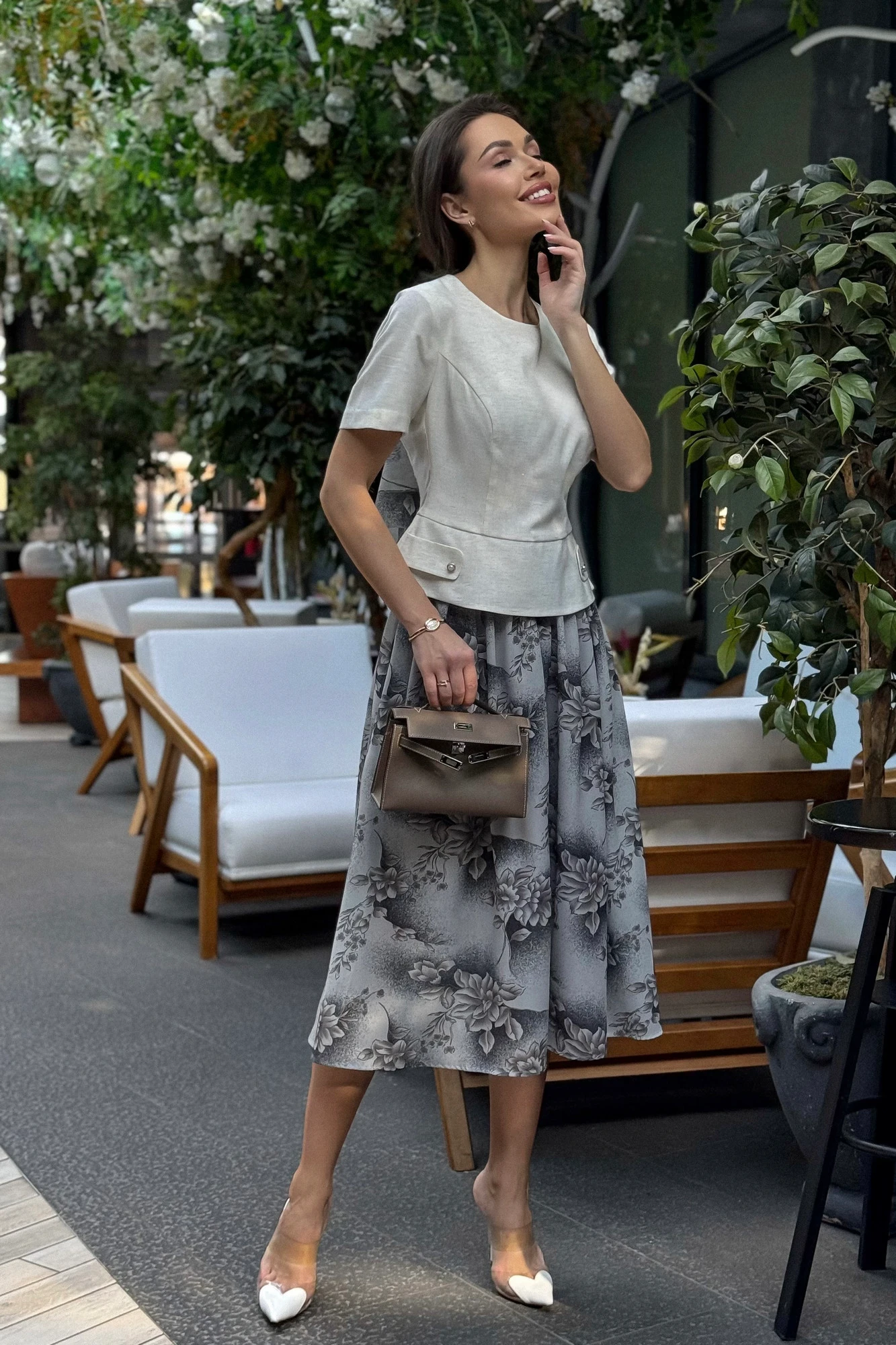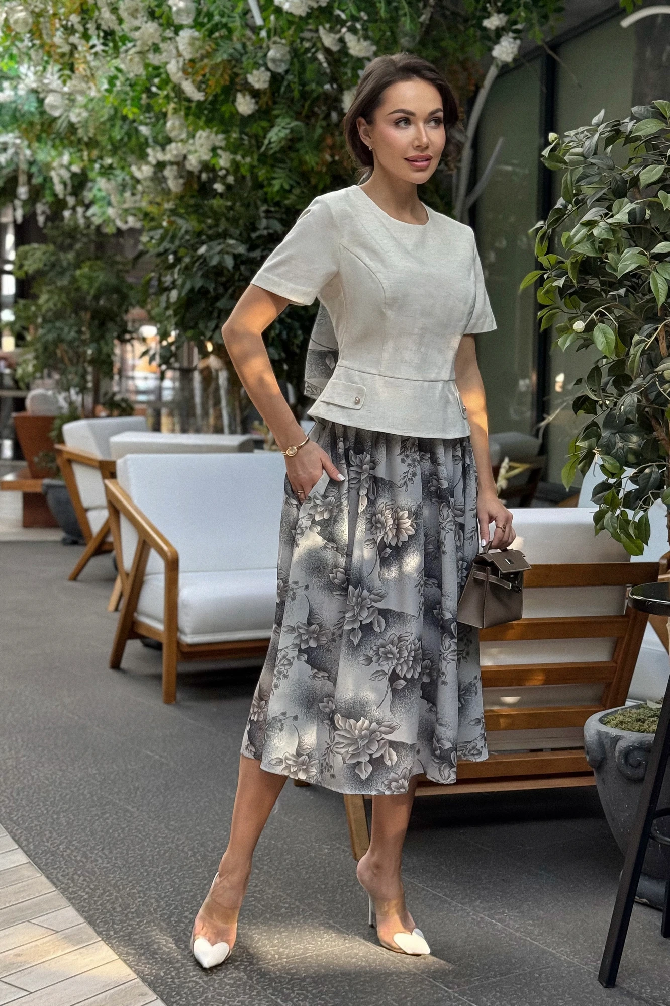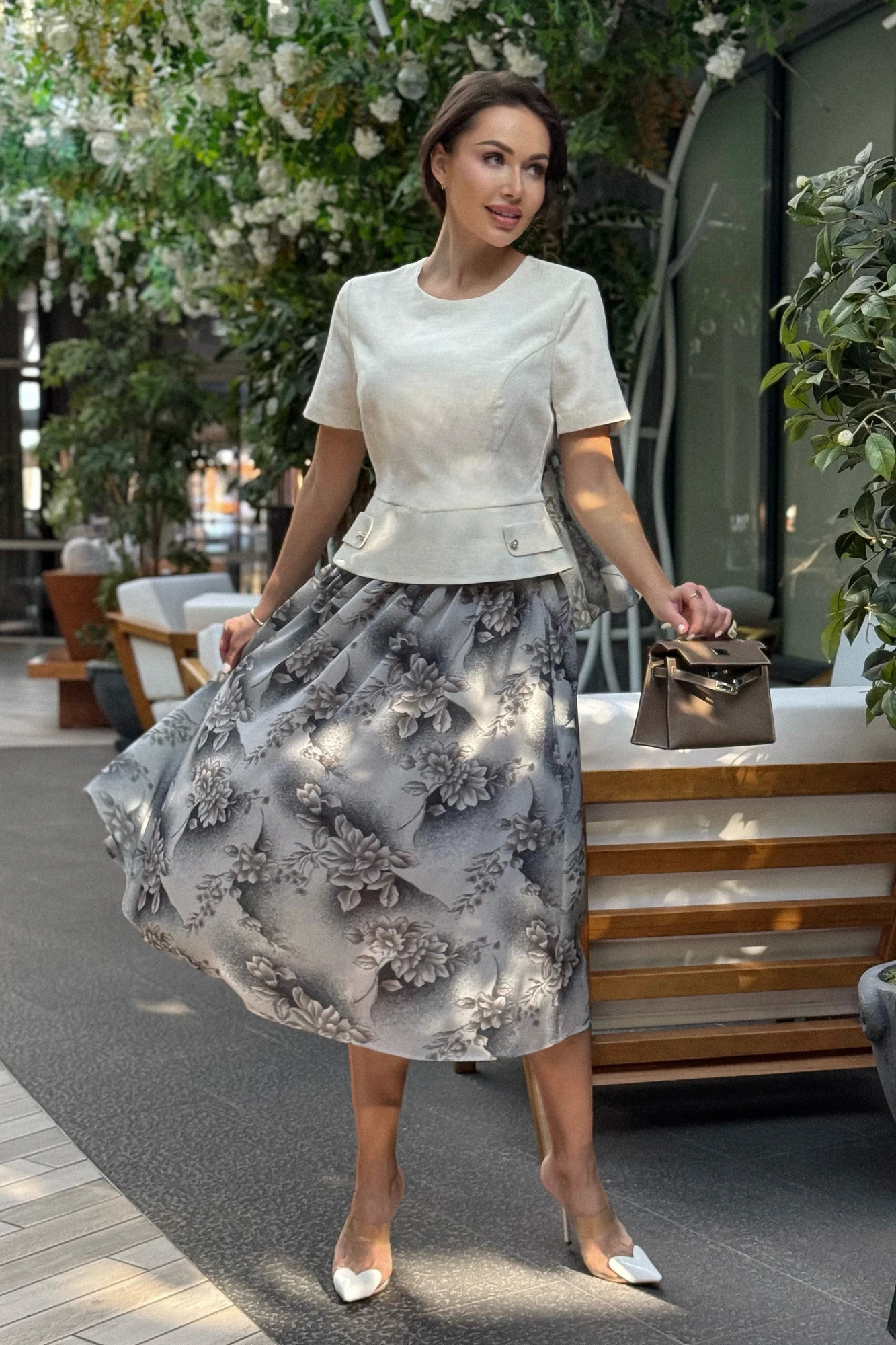 Рукава втачные, одношовные, короткие, без подкладки. Юбка женская, выполнена из плательной ткани, с посадкой на талии, расклешенная к низу, на трикотажной подкладке, на притачном поясе, застегивающимся на 1 петлю и 1 пуговицу, с односторонними складками по талии.Заднее полотнище со средним швом, в верхней части которого обработана застежка на потайную тесьму - ""молнию"". В боковых швах расположены карманы. Низ юбки обработан швом вподгибку с закрытым срезом, с отделочной строчкой 0,5 см. По поясу прострочена отделочная строчка 0,2 см.