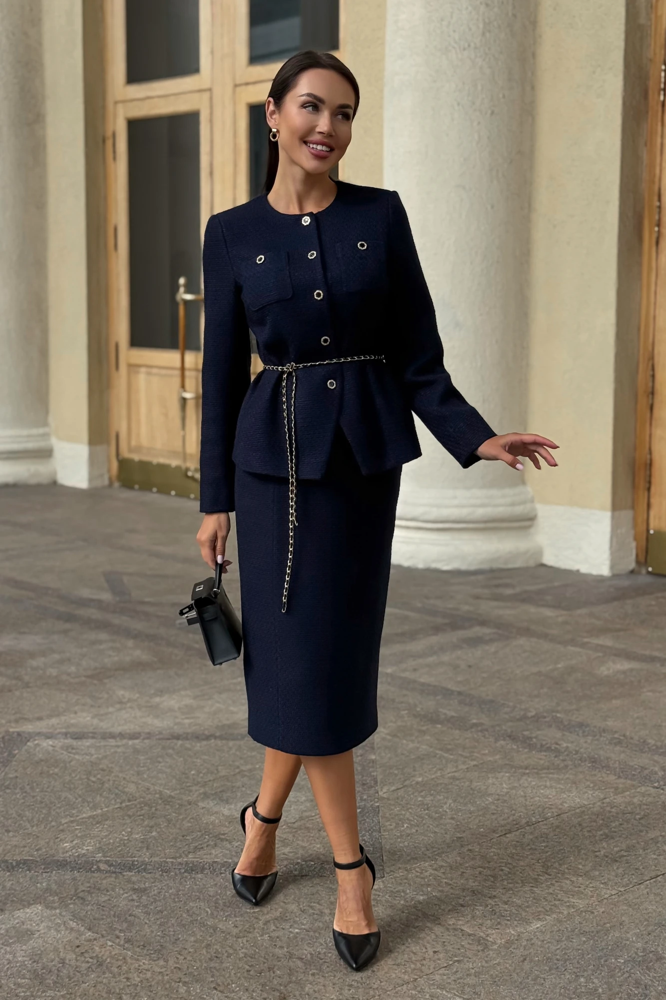 Юбка зауженная к низу, на притачном поясе, застегивающимся на 1 петлю и пуговицу. Переднее полотнище с рельефными швами. Заднее полотнище с талиевыми вытачками, со средним швом, в верхней части которого обработана застежка на потайную тесьму-молнию, в нижней – шлица. Юбка на притачной по низу подкладке. В размерах 50,52,54 в поясе на уровне боковых швов предусмотрены резинки, для лучшего прилегания по талии. Средняя длина жакета по среднему шву спинки 58,0 см, (±2,0 см);