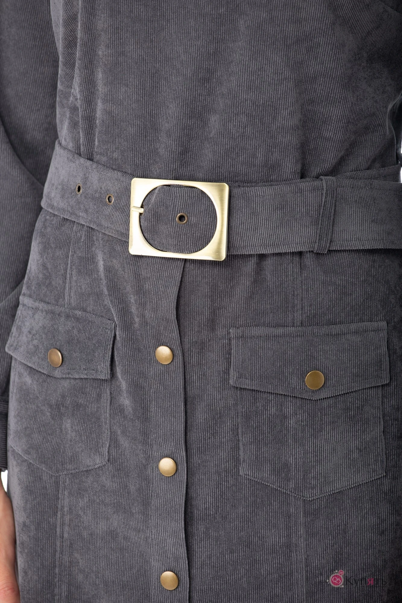 На передних частях лифа обработаны нагрудные вытачки, низ платья выполнен с вертикальными рельефами, декоративной планкой с петлями и пуговицами. На лифе и нижней части платья обработаны накладные карманы с клапанами.