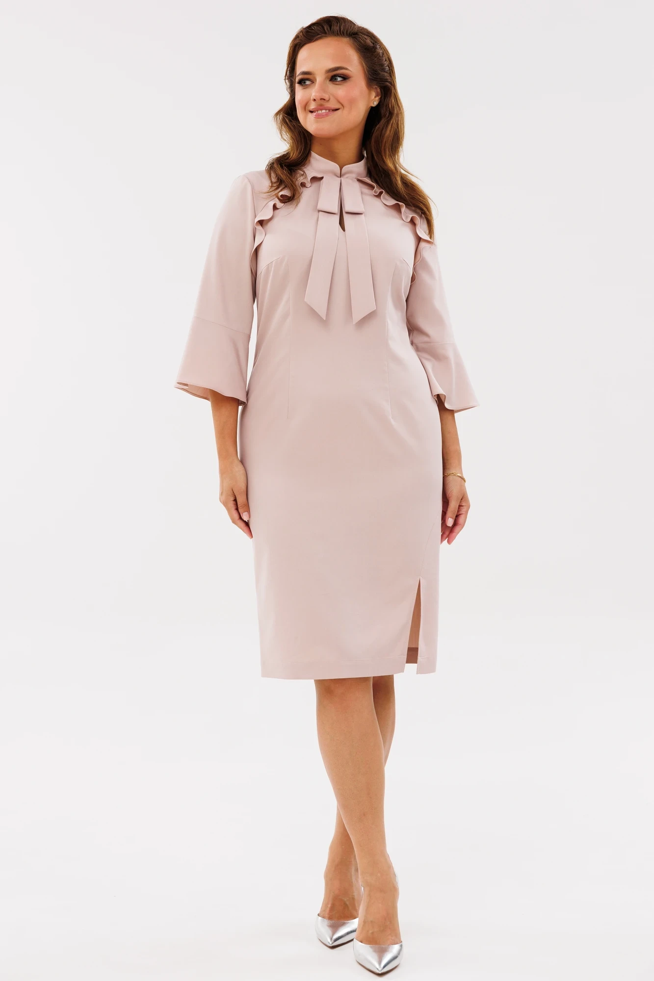 Платье прилегающего силуэта. Горловина обработана воротником стойка с втачным галстуком в виде банта и вырезом ""капелька"" с застёжкой на навесную петлю и пуговицу. По переду платья фигурные подрезы с декоративной рюшей, талиевые и нагрудные вытачки. Нотку пикантности добавляет фигурный разрез по низу. По спинке талиевые вытачки и средний шов, в котором обработана потайная молния. Рукав втачной длиной ¾ с широким воланом по низу."