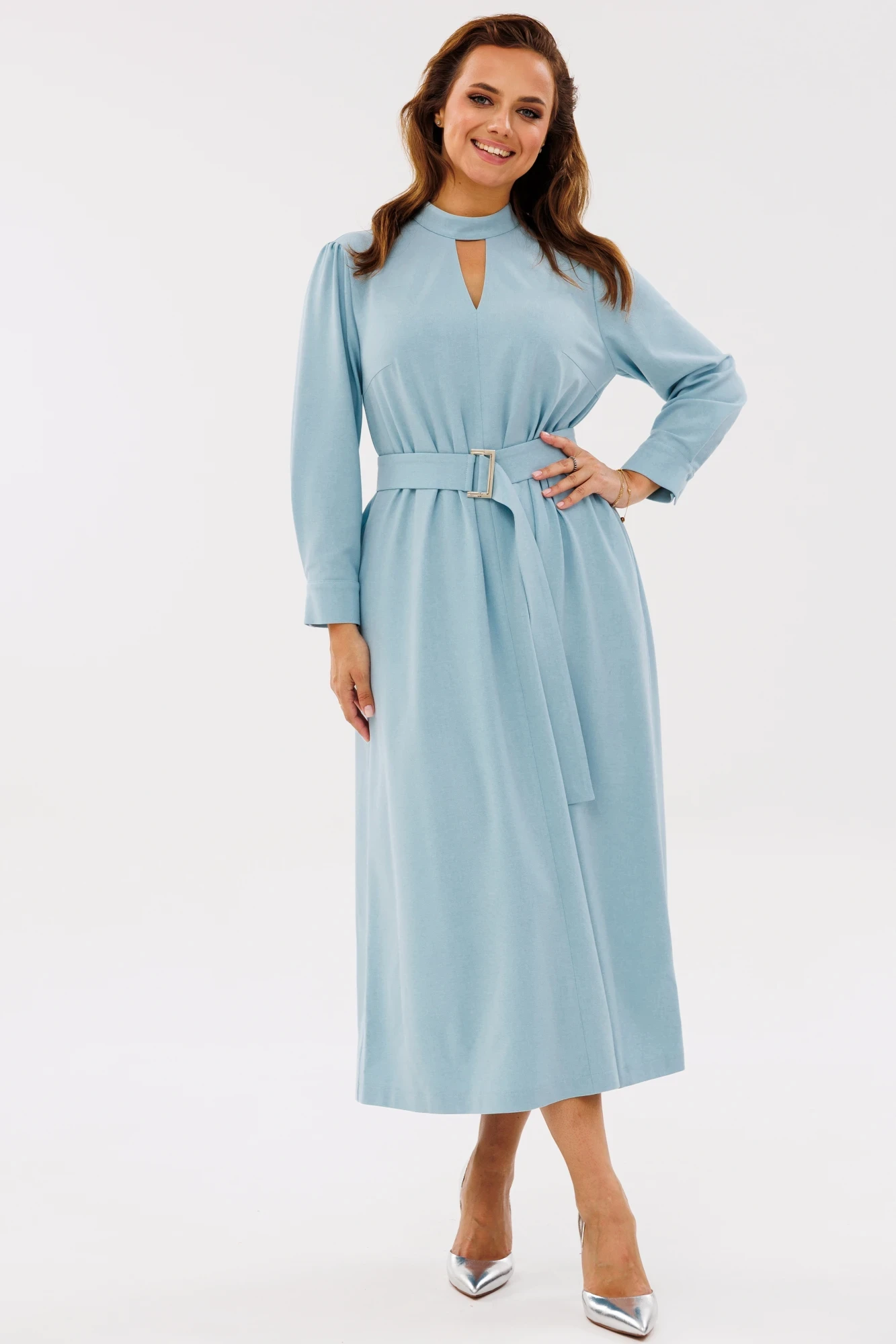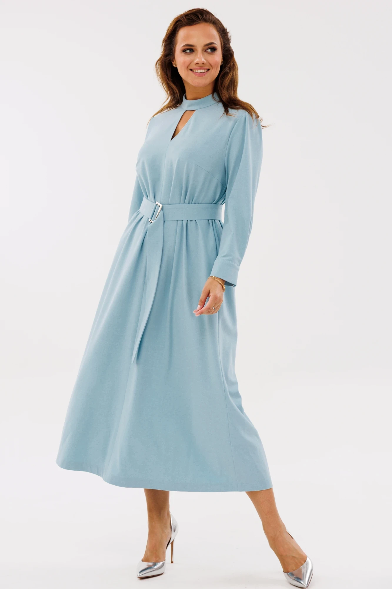 56Платье А-силуэта длиной миди. Горловина на притачной стойке с V-образным вырезом, по спинке с застежкой на кнопки. Перед платья с нагрудными вытачками и средним швом. Спинка со средним швом. В боковых швах обработаны карманы. Рукав втачной длиной ⅞, со сборкой по окату, по низу рукава - манжет с застежкой на петлю и пуговицу. В комплекте пояс из основной ткани.